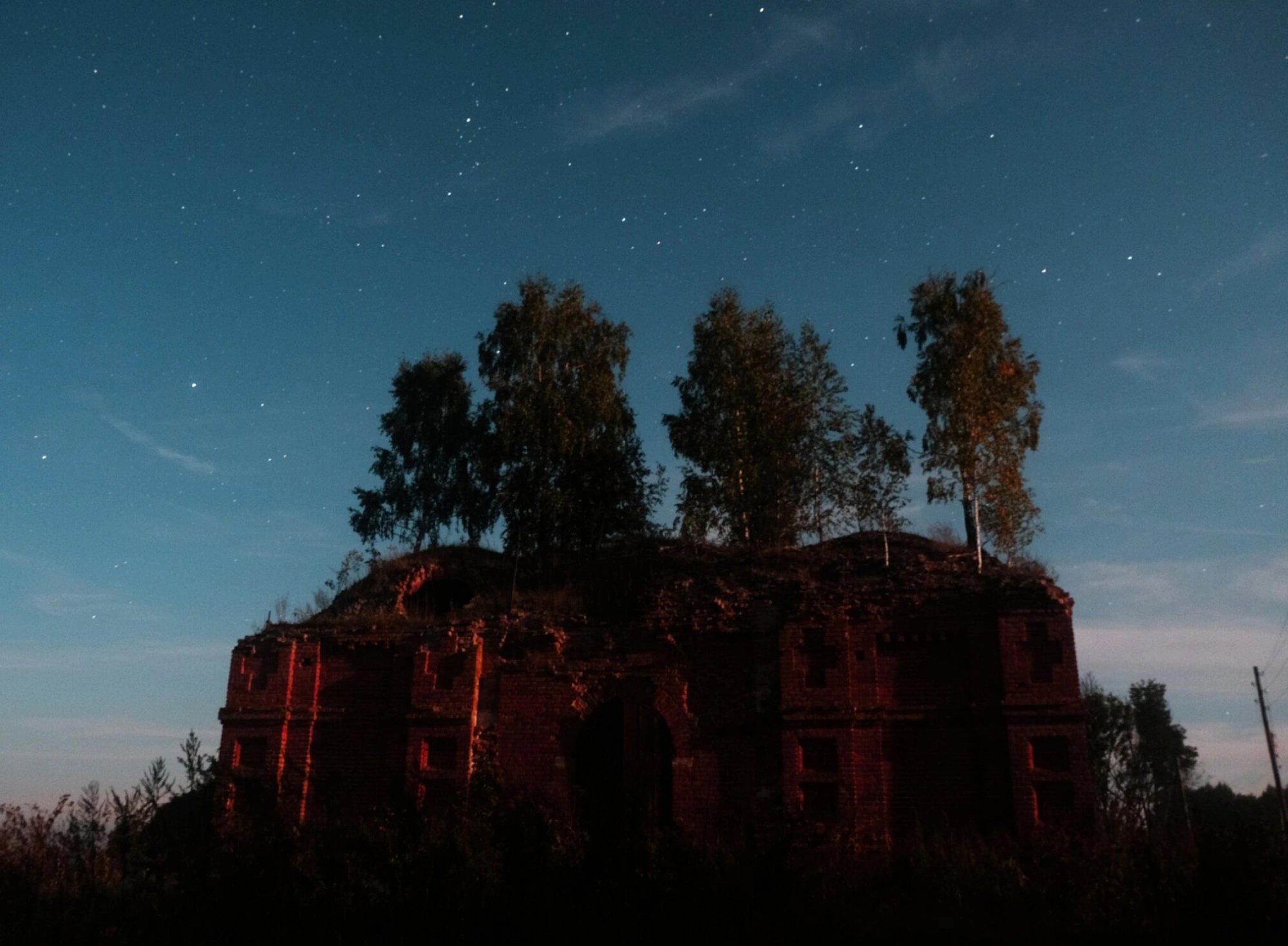 На снимке храм предстает в ночном освещении, где темное небо с видимыми звездами создает особую атмосферу духовного упования. Деревья, проросшие на возвышенности, где стоит церковь, напоминают о периоде забвения, через который прошла эта святыня. Несмотря на испытания, храм продолжает стоять как символ веры и надежды, постепенно возвращая былое благолепие благодаря трудам верующих и настоятеля.