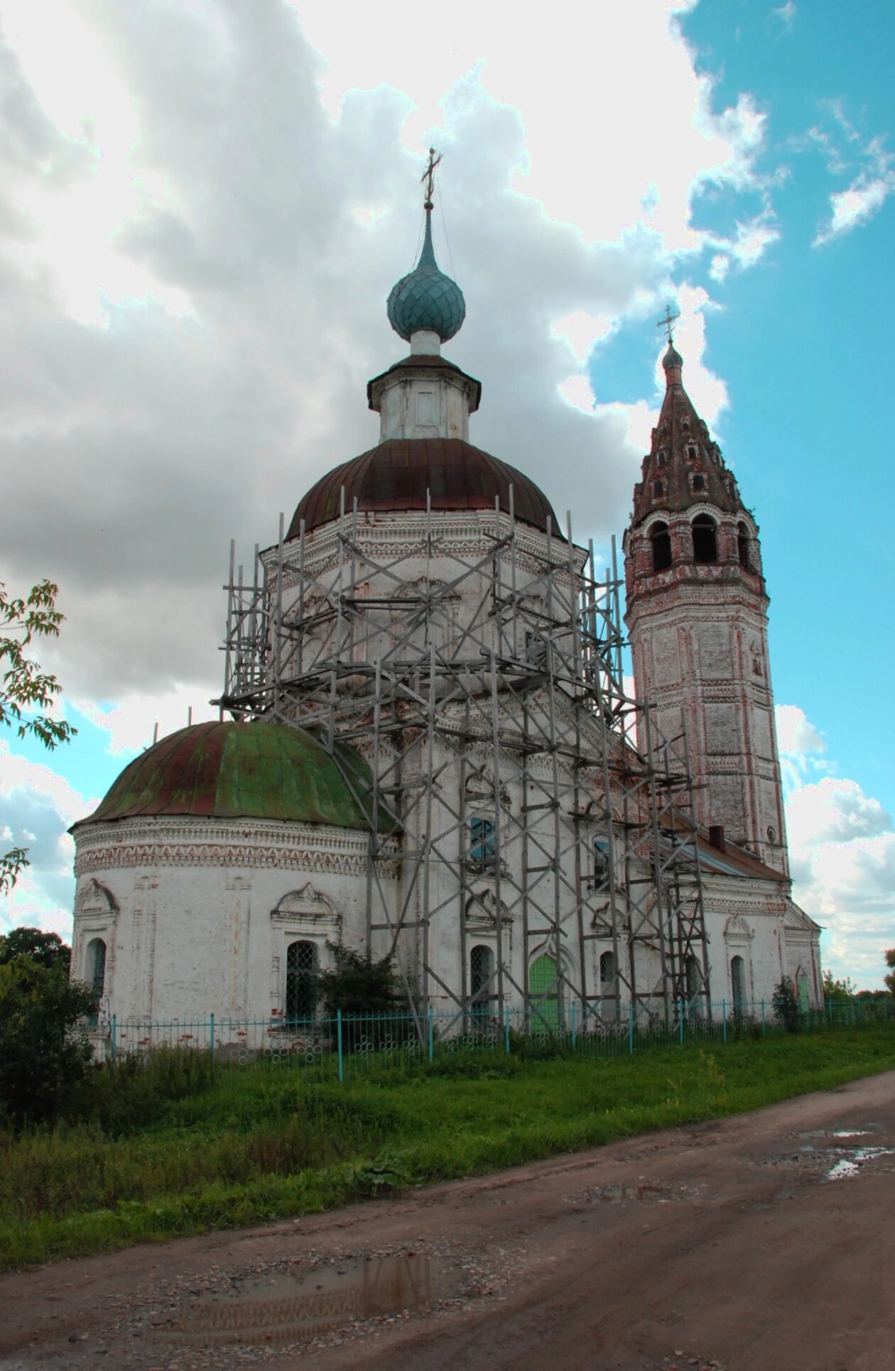 Храм представляет собой четверик, увенчанный мощным световым барабаном с главкой, к которому примыкает обширная апсида и трапезная часть. Колокольня, выполненная в ярусной конструкции, была пристроена к основному объёму в более поздний исторический период. На снимке хорошо видны конструкции строительных лесов, окружающие колокольню и частично основной объём, что свидетельствует о проведении масштабных реставрационно-восстановительных работ, направленных на сохранение этого уникального памятника культурного наследия.
