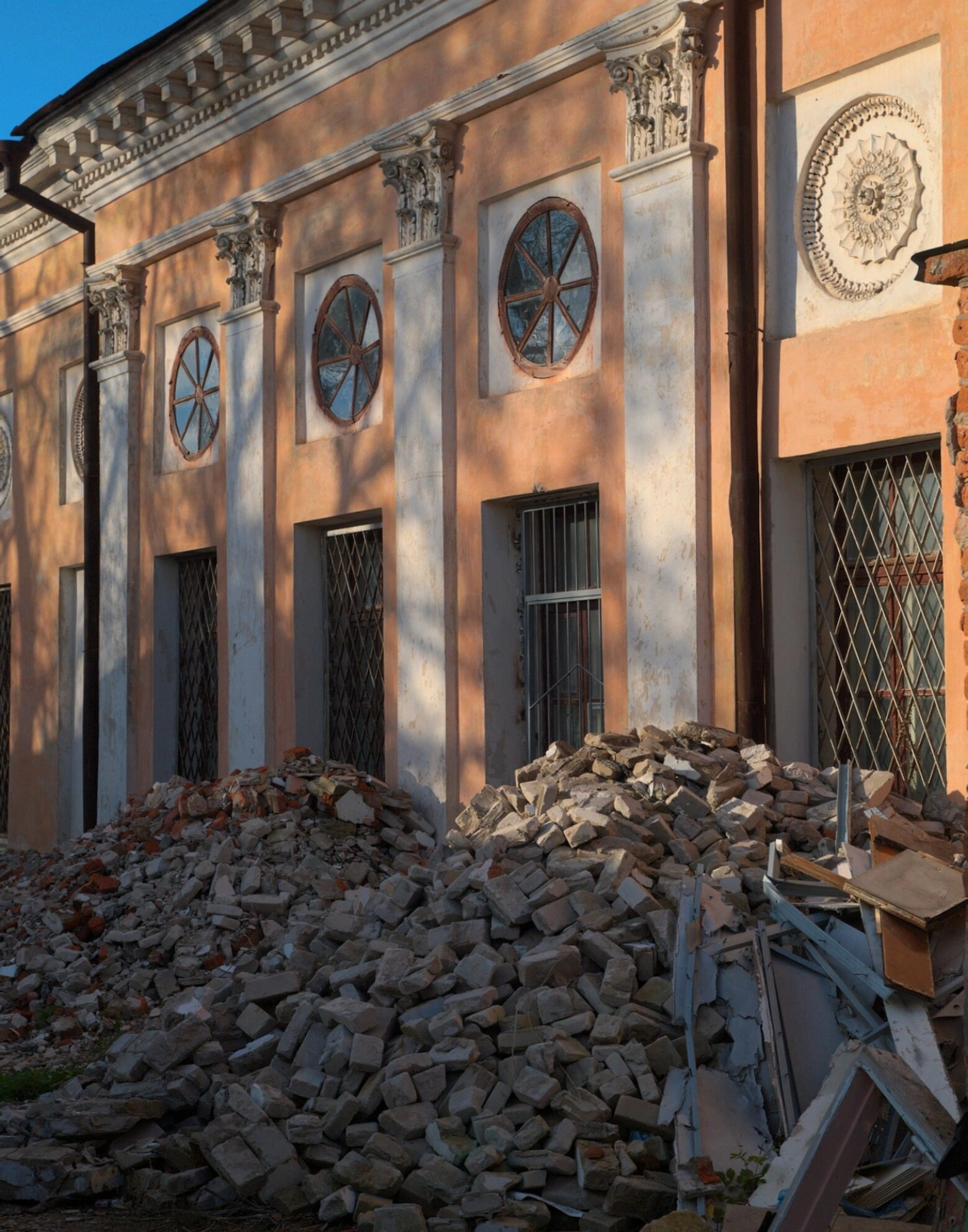 На переднем плане видны кирпичи и строительные материалы, свидетельствующие о активной фазе восстановительных работ. Эти усилия направлены на возвращение святыне её первоначального благолепия после decades запустения в годы богоборчества. Храм, в котором ранее располагался архив, постепенно возрождается силами верующих и благотворителей.
