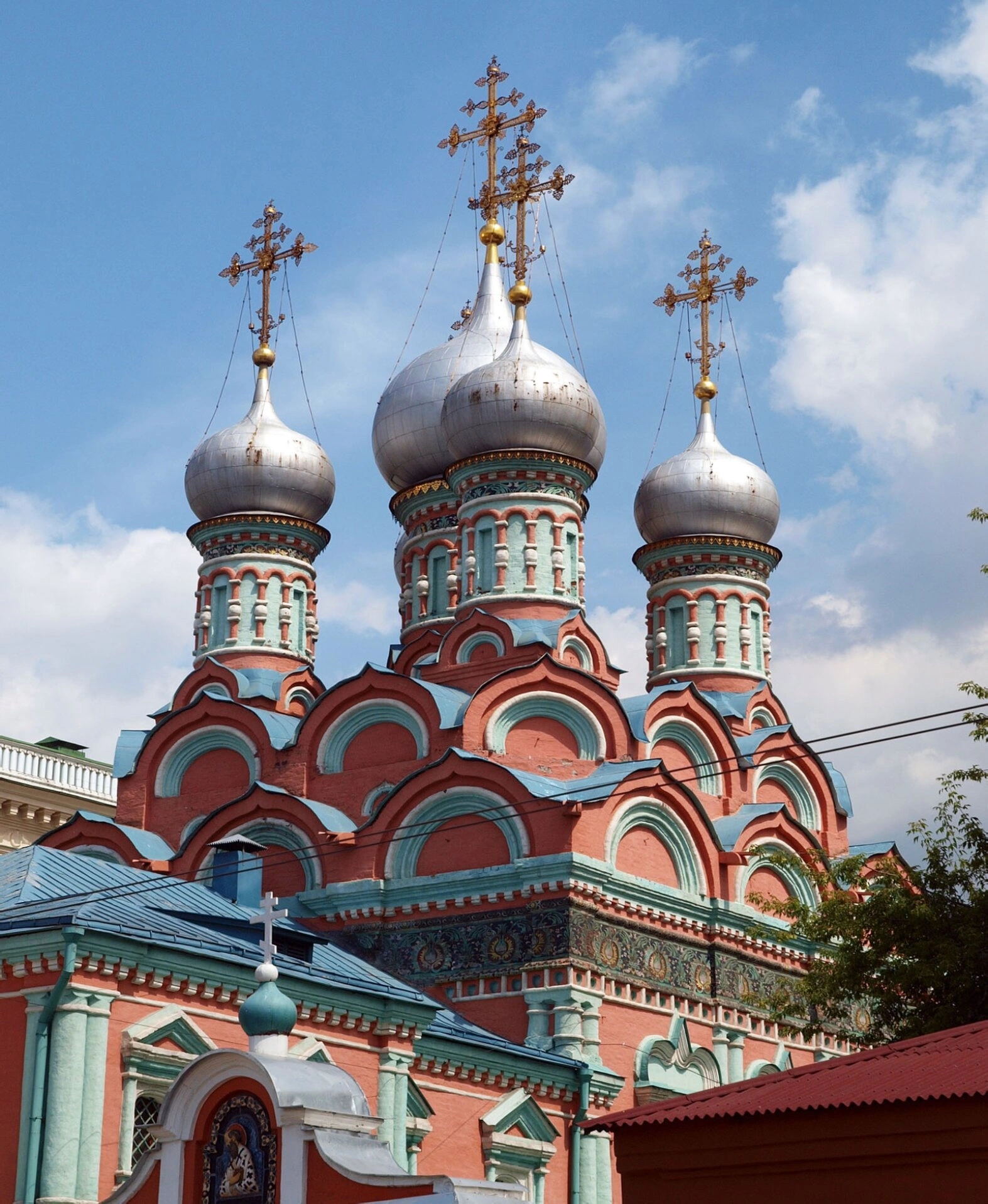 На представленной фотографии запечатлен величественный православный храм во имя святителя Григория Неокессарийского, расположенный в историческом центре Москвы на улице Большая Полянка. Святыня находится в районе Якиманка и является выдающимся памятником русского церковного зодчества середины XVII века.