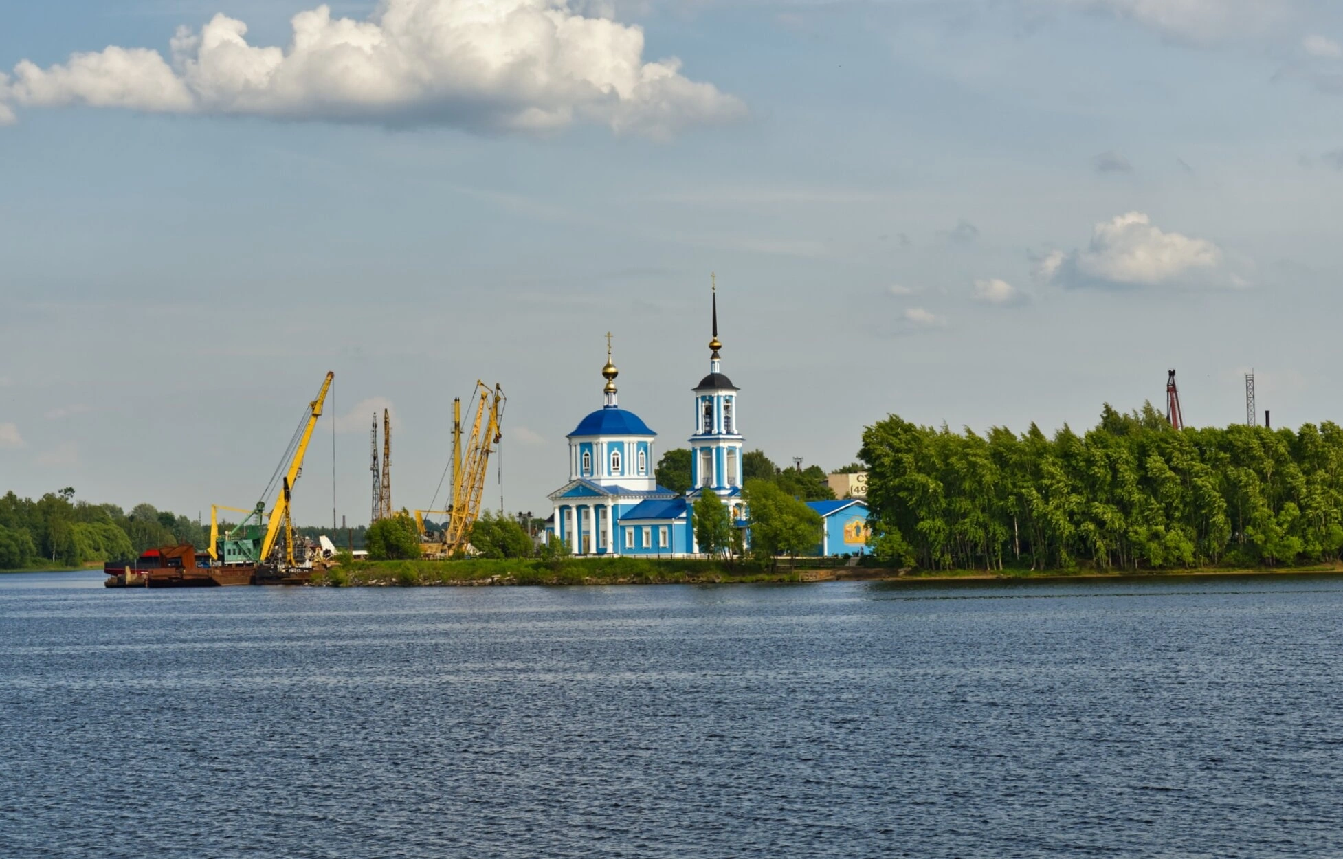 Справа от храма виден береговой участок, покрытый густой зеленью деревьев, что создает особую гармонию между творением рук человеческих и природной красотой. С левой стороны наблюдается строительная площадка с плавучими объектами и подъемными кранами, свидетельствующая о проводимых работах по благоустройству территории.