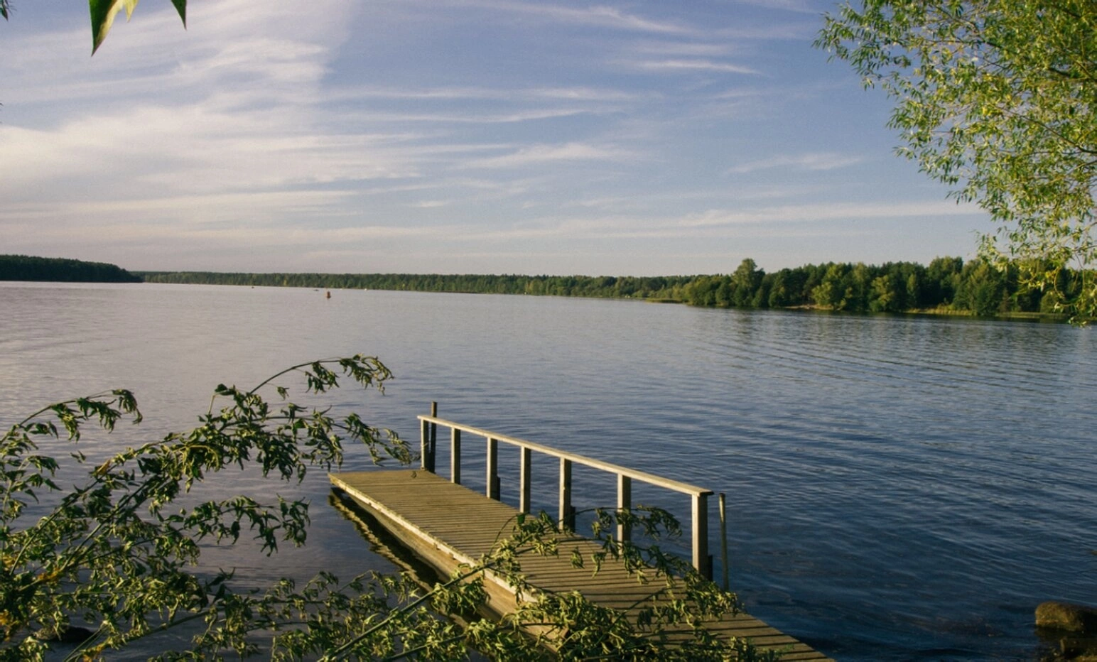 На переднем плане изображения виден деревянный пирс с аккуратными перилами, уходящий в спокойные воды реки. Водная гладь отражает небесную лазурь с легкими облачными образованиями, создавая атмосферу благодатного умиротворения. По обеим сторонам от пирса произрастают местные растения и деревья, характерные для среднерусской природы.