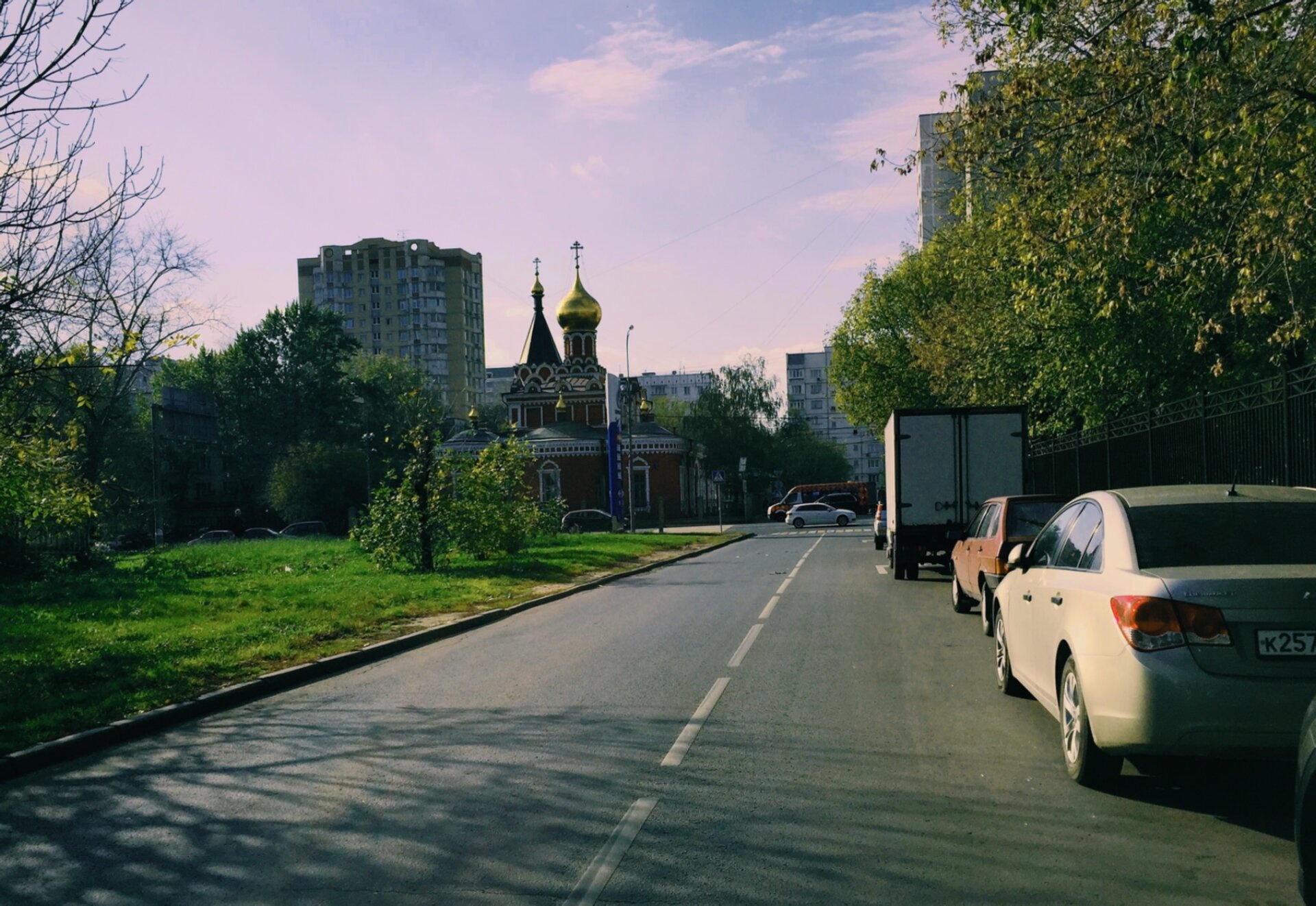 На представленной фотографии запечатлён вид на Цветочный проезд в районе Марьина Роща в Северо-Восточном административном округе Москвы. Архитектурной доминантой снимка и главной духовной жемчужиной этой местности является храм в честь иконы Божией Матери «Нечаянная Радость».