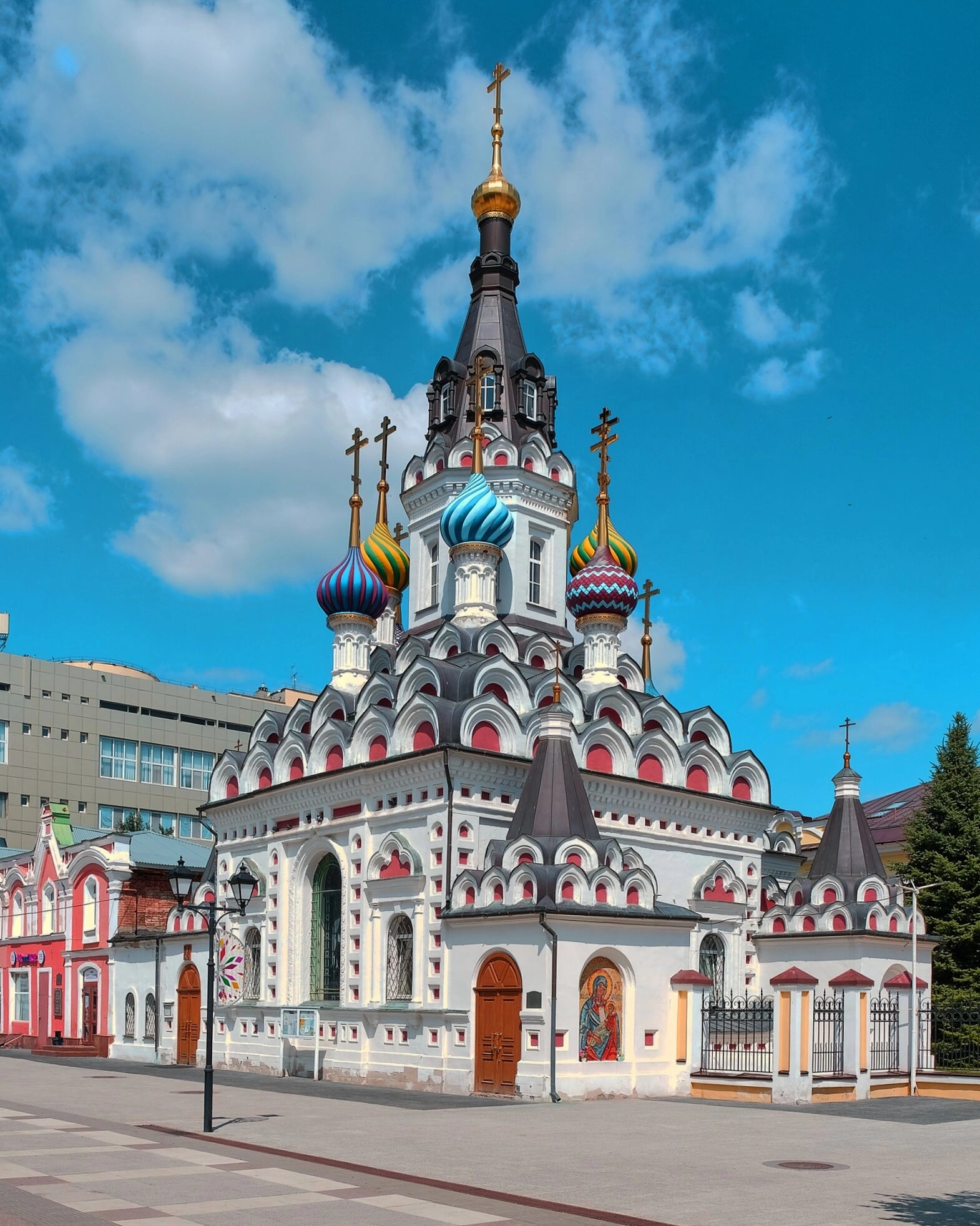 Особую праздничность и узнаваемость храму придают его яркие разноцветные купола, сияющие на солнце. Каждый купол уникален по своей форме и отделке, создавая сложную и гармоничную композицию. Фасад здания богато украшен кирпичным узорочьем, резными наличниками и кокошниками, что является классическим образцом русского церковного зодчества XVI века.