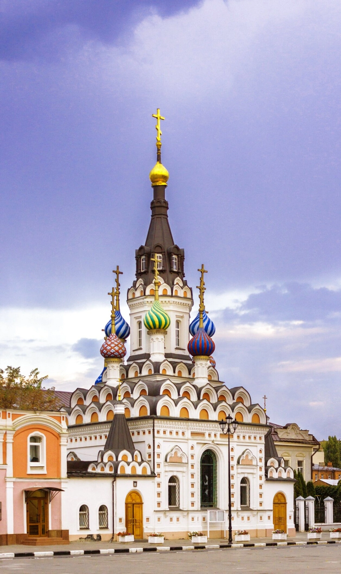 Архитектурный облик храма, освящённого в 1906 году, восходит к лучшим традициям русского стиля. Многоглавная композиция, состоящая из декоративных шатров и изящных главок, напоминает собор Василия Блаженного в Москве, создавая торжественное и праздничное настроение. Центральный золотой купол, увенчанный православным крестом, гордо возносится к небу, а окружающие его яркие луковичные главки дополняют живописный силуэт.