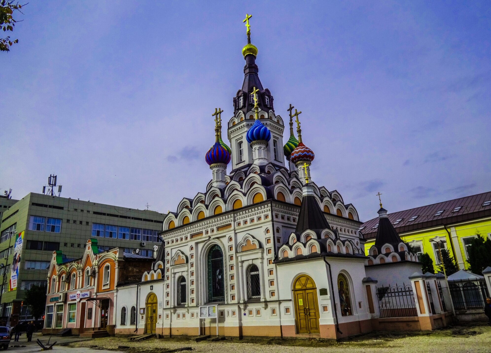 На фотографии запечатлён храм в честь иконы Божией Матери «Утоли моя печали», расположенный в историческом центре Саратова на улице Волжской. Этот православный храм, являющийся архитектурной доминантой города, был возведён в 1904–1906 годах как церковь-часовня при Архиерейском доме по благословению священномученика Гермогена, епископа Саратовского и Царицынского. Автор проекта, саратовский архитектор Пётр Митрофанович Зыбин, создал уникальную каменную шатровую церковь, которая представляет собой произвольную, уменьшенную копию московского Покровского собора, более известного как собор Василия Блаженного.