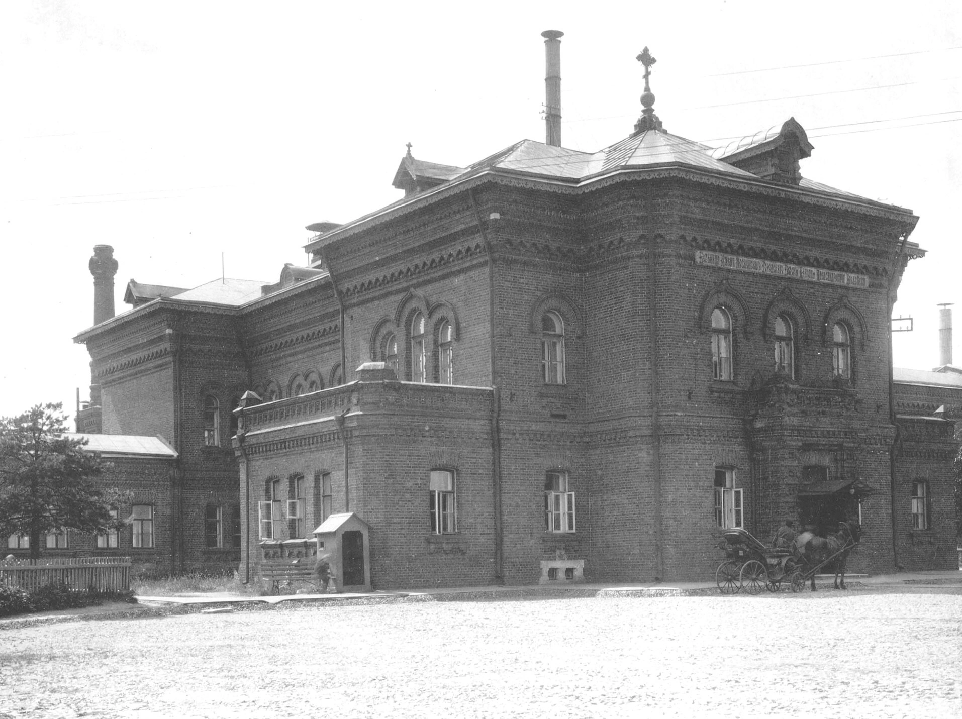 На представленной фотографии запечатлён храм в честь иконы Божией Матери «Всех скорбящих Радость», расположенный на территории Московской городской психиатрической больницы № 1 имени Н. А. Алексеева, исторически известной как «Канатчикова дача». Святыня была воздвигнута в 1903–1906 годах по инициативе и на средства почётного гражданина Москвы Николая Алексеева, который являлся тогда городским головой и известным меценатом. Храм строился специально для окормления пациентов лечебницы и медицинского персонала.