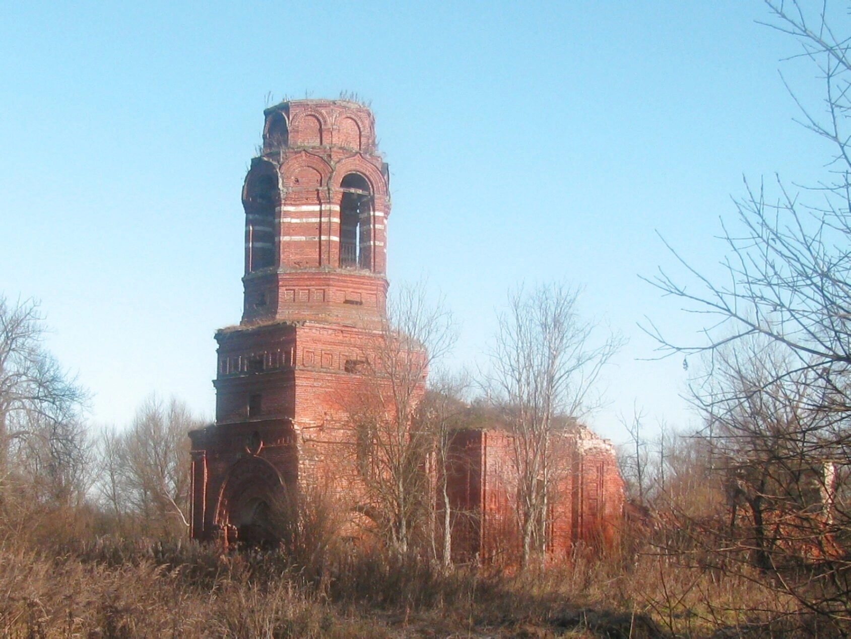 На представленной фотографии запечатлён вид полуразрушенного каменного храма в честь иконы Божией Матери «Всех Скорбящих Радость», расположенного в деревне Телешово Лотошинского района Московской области. Святыня, ныне пребывающая в запустении, является памятником культурного наследия и свидетельствует о былой духовной жизни этого края.