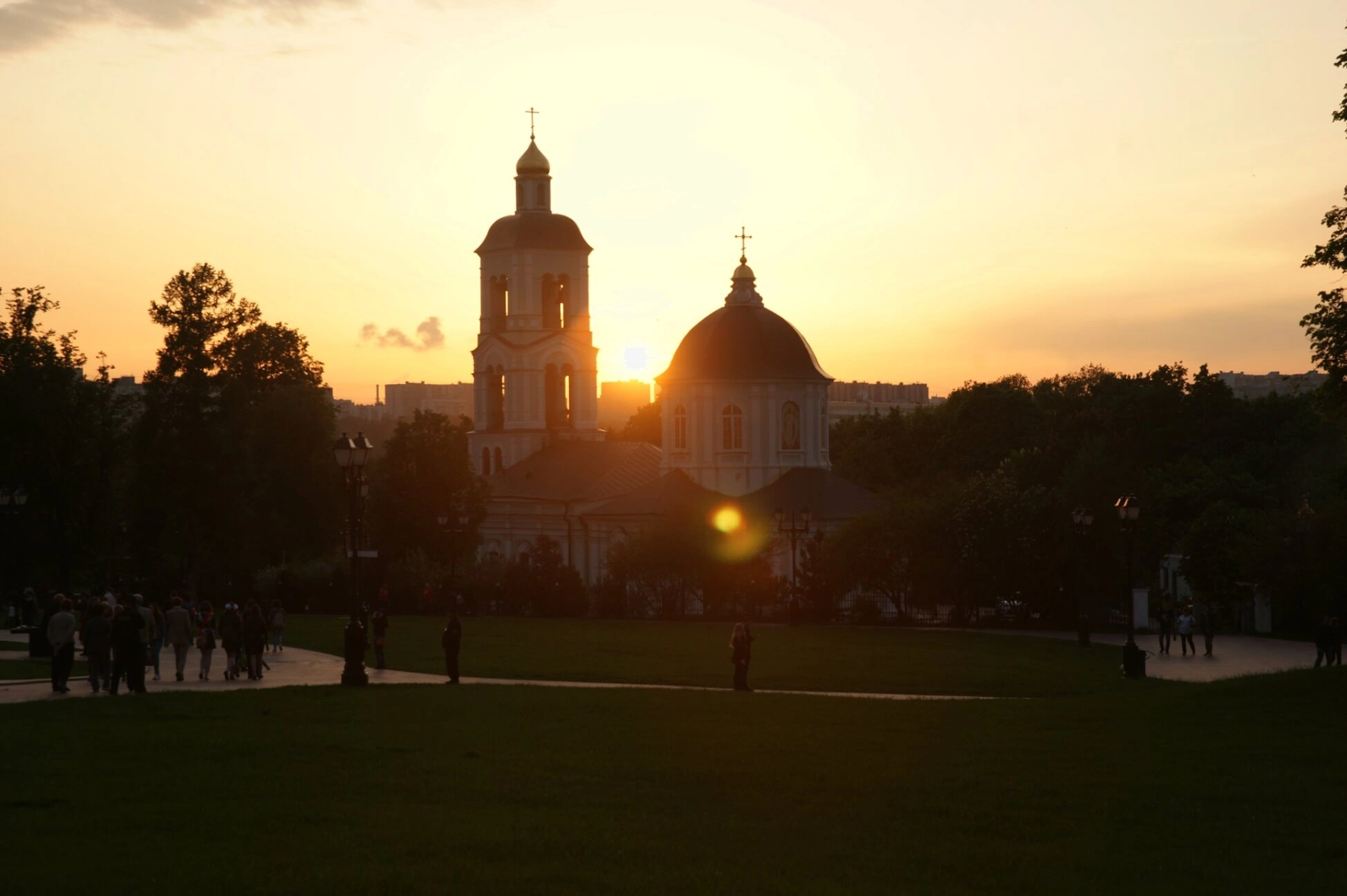 На фотографии запечатлён храм в честь иконы Божией Матери «Живоносный Источник», расположенный на территории государственного музея-заповедника «Царицыно» в Москве. Это древнейший из сохранившихся архитектурных памятников знаменитого дворцово-паркового ансамбля. Снимок сделан в тихое время на закате или рассвете, когда мягкий солнечный свет, пробиваясь сквозь парковую листву, озаряет белоснежные стены и создаёт благодатное сияние вокруг главки с крестом. Храм, окружённый ухоженным газоном и вековыми деревьями, предстаёт в безмолвной молитве, а его ясные силуэты чётко вырисовываются на фоне небес. На переднем плане видны парковые дорожки, где в час прогулок проходят прихожане и гости этих благодатных мест.