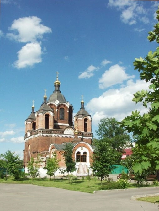 На снимке храм представлен в ясный день: на фоне голубого неба с белыми облаками выделяются его тёмные купола с золотыми крестами. Территория вокруг ухожена, видны зелёные насаждения, деревья и пешеходные дорожки. Фотография передаёт спокойную и благоговейную атмосферу, окружающую этот исторический православный объект.