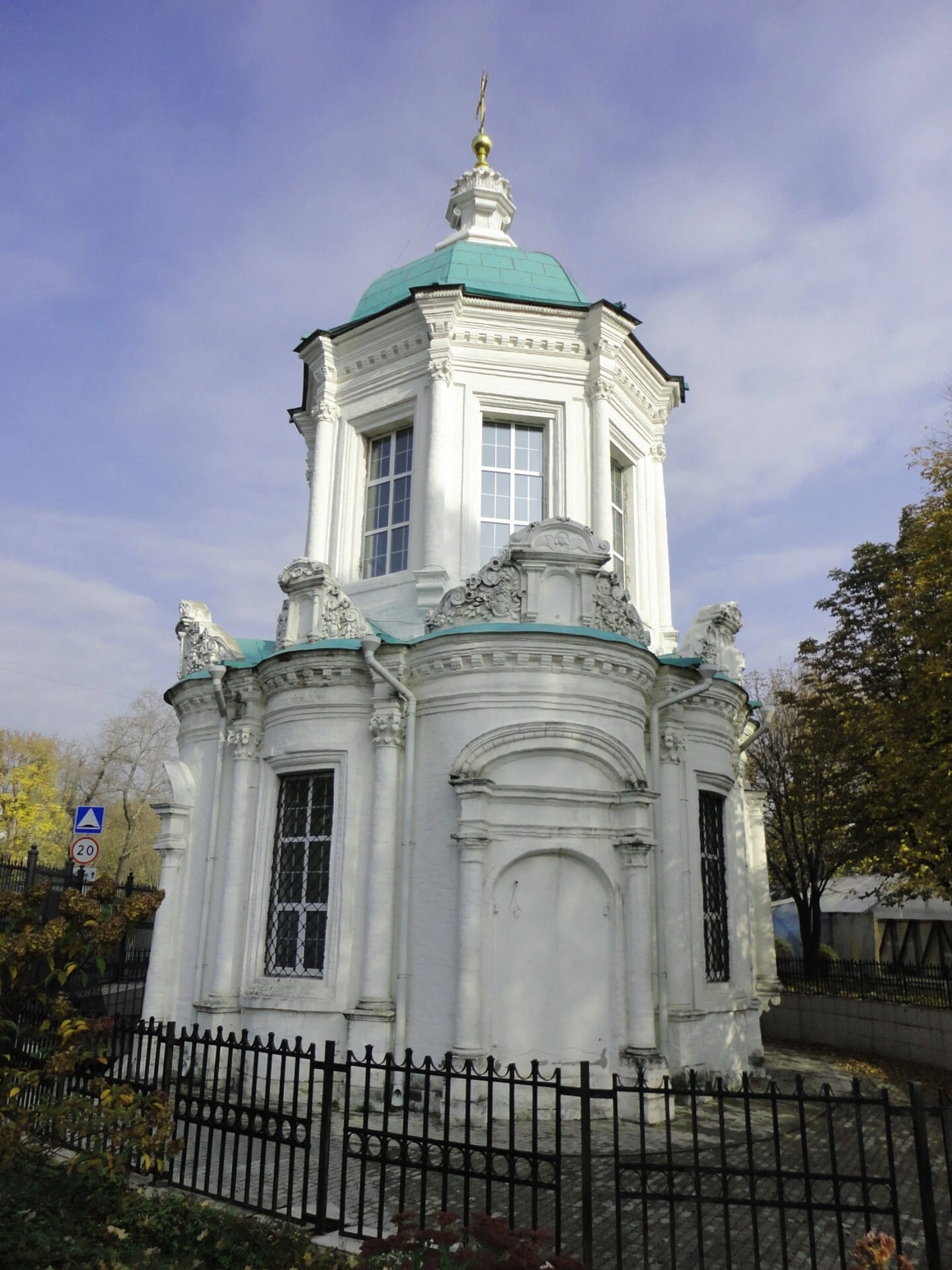 На фотографии храм предстаёт в окружении чёрного металлического ограждения, подчеркивающего его значимость и выделяющего сакральное пространство. На заднем плане виднеются деревья в осеннем убранстве, что указывает на время съёмки, а чистое голубое небо добавляет кадру возвышенности и светлости. Храмовая икона Божией Матери «Знамение» особо почитается верующими, а сама церковь является не только действующим приходом, но и духовным центром для жителей столицы.