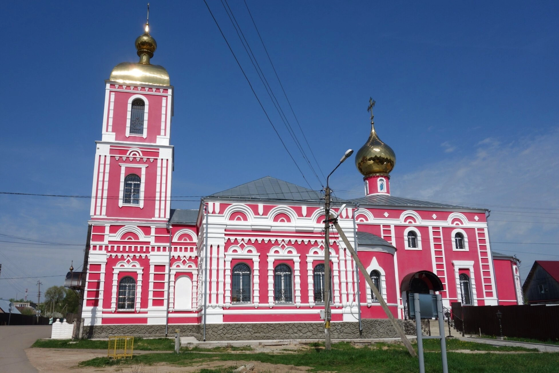 Архитектурный облик храма представляет собой прекрасный пример православного церковного зодчества. Здание выполнено в традиционных формах с выразительным сочетанием розовых стен и белых декоративных элементов. Золотые купола, венчающие храм и колокольню, создают торжественный образ и символизируют горний мир.