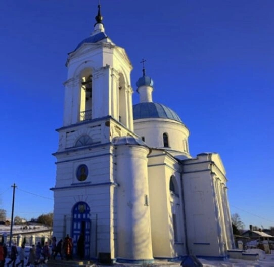 На переднем плане у входа в дом Божий видны фигуры прихожан, что подчёркивает действующий статус храма и его значение как центра духовной жизни для верующих. Окружающий зимний пейзаж с запорошёнными снегом деревьями добавляет снимку умиротворённости и тихой, созерцательной красоты, характерной для русской природы.