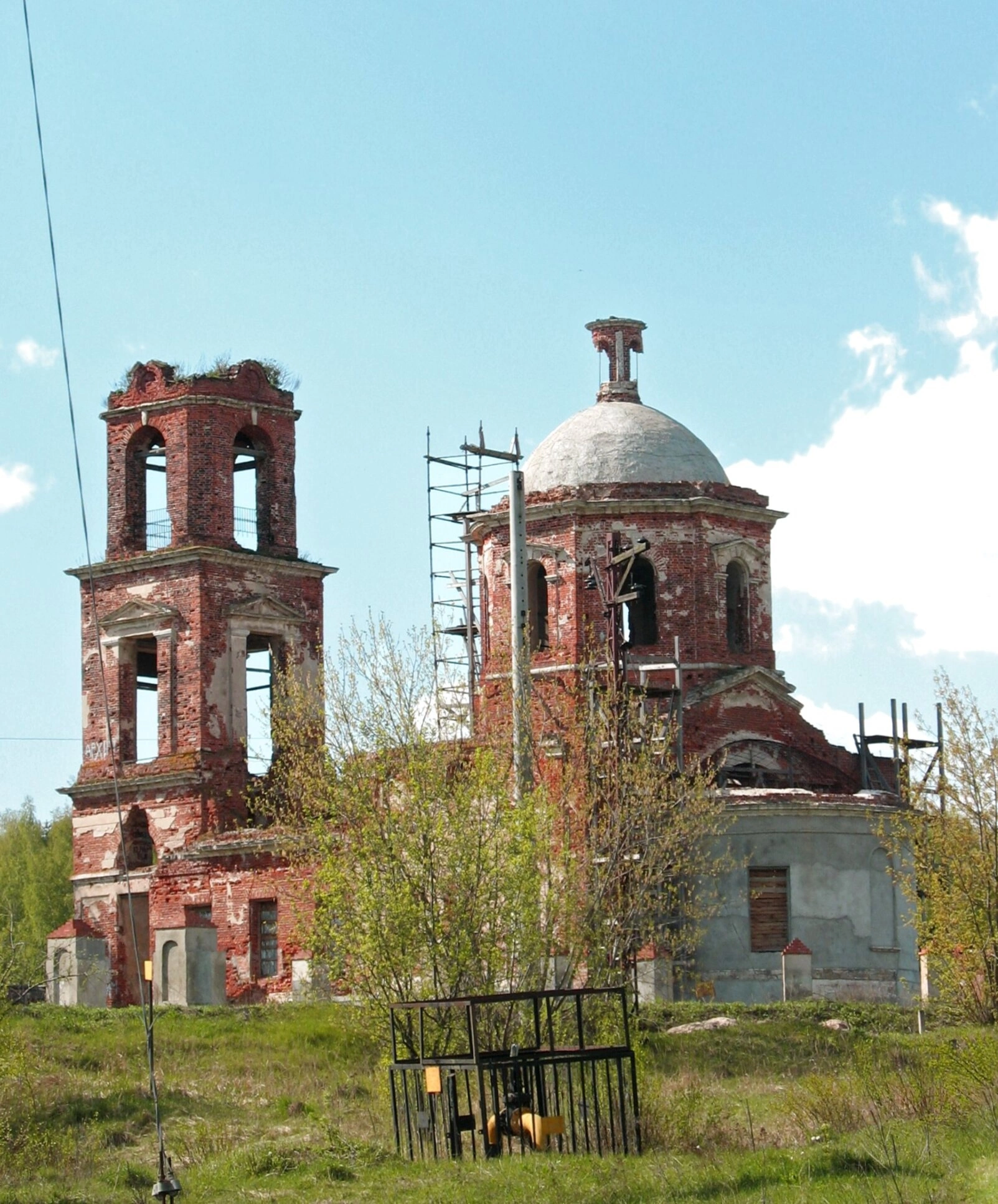 На снимке видны следы многолетнего запустения советского периода, когда храм был закрыт и использовался не по назначению. В то же время фотография фиксирует важный момент возрождения святыни: установленные строительные леса свидетельствуют о проведении масштабных реставрационно-восстановительных работ, направленных на возвращение храму его первоначального исторического облика и духовного предназначения.