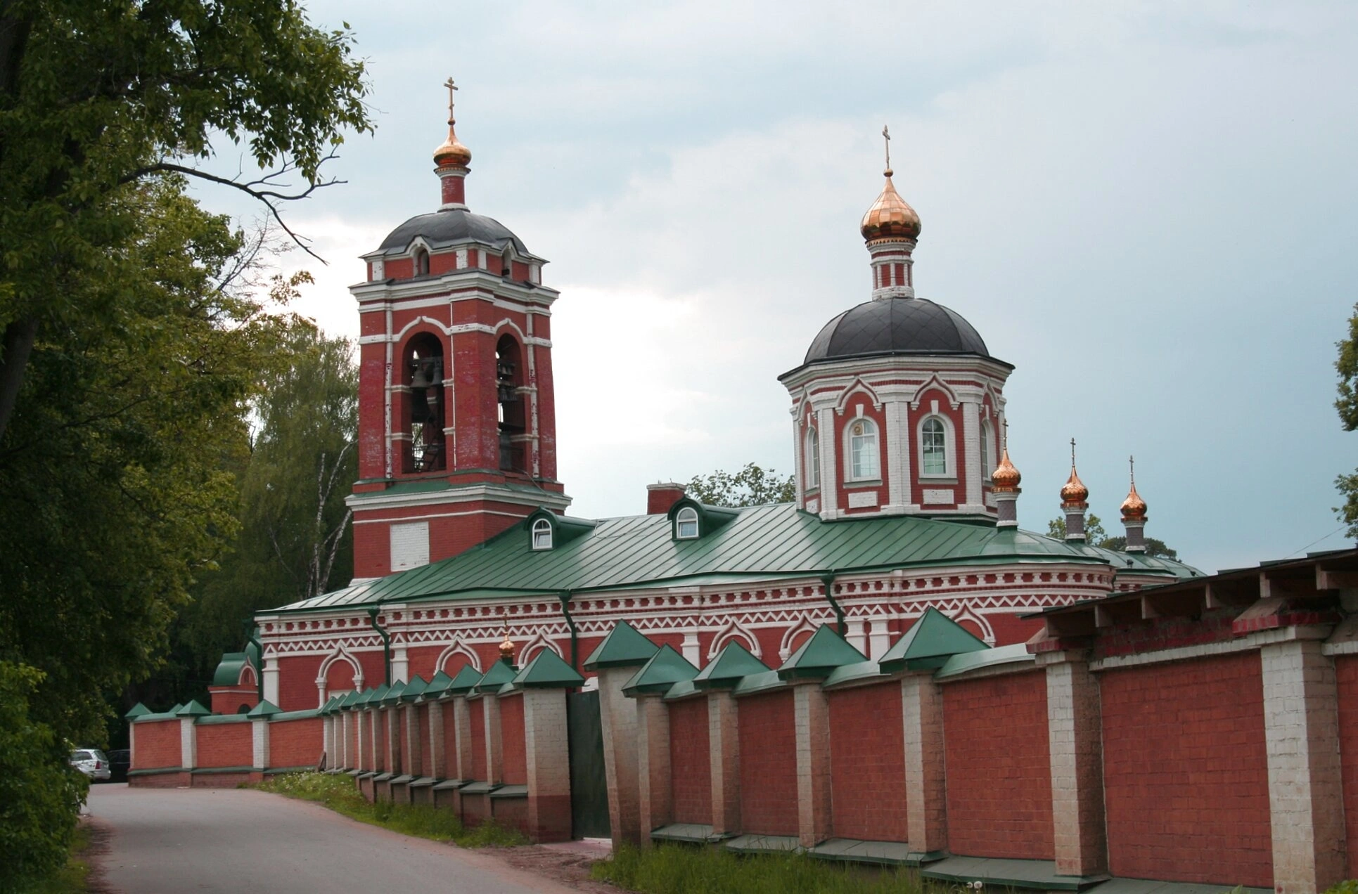Фасад здания выполнен из красного кирпича и украшен белокаменными декоративными элементами — наличниками, карнизами и колонками, что придаёт храму нарядный и торжественный вид. Снимок передаёт строгую красоту и величие православной святыни. Храм обнесён невысокой кирпичной оградой, а перед ним пролегает грунтовая дорога. Пасмурное небо на фоне создаёт особое, созерцательное настроение, подчёркивая вечность и неизменность духовных ценностей.