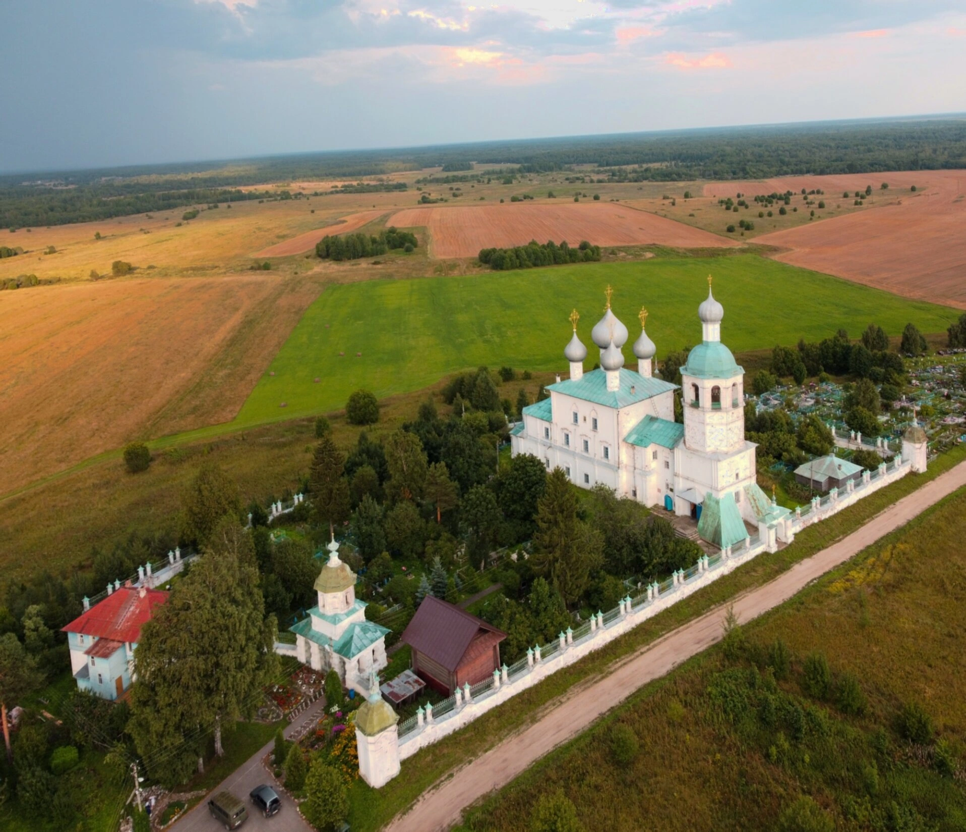 Храмовый комплекс обнесён оградой, вокруг виднеются скромные строения и деревья, гармонично вписанные в окружающий ландшафт. На заднем плане простираются бескрайние поля и густые леса Вологодчины, создающие ощущение умиротворения и вечной духовной связи человека с творением Божиим. Небесный свод с облаками мягко освещает всю картину, наполняя её благодатным светом. Этот святой уголок русской земли является ярким свидетельством глубокой веры и благочестия наших предков.