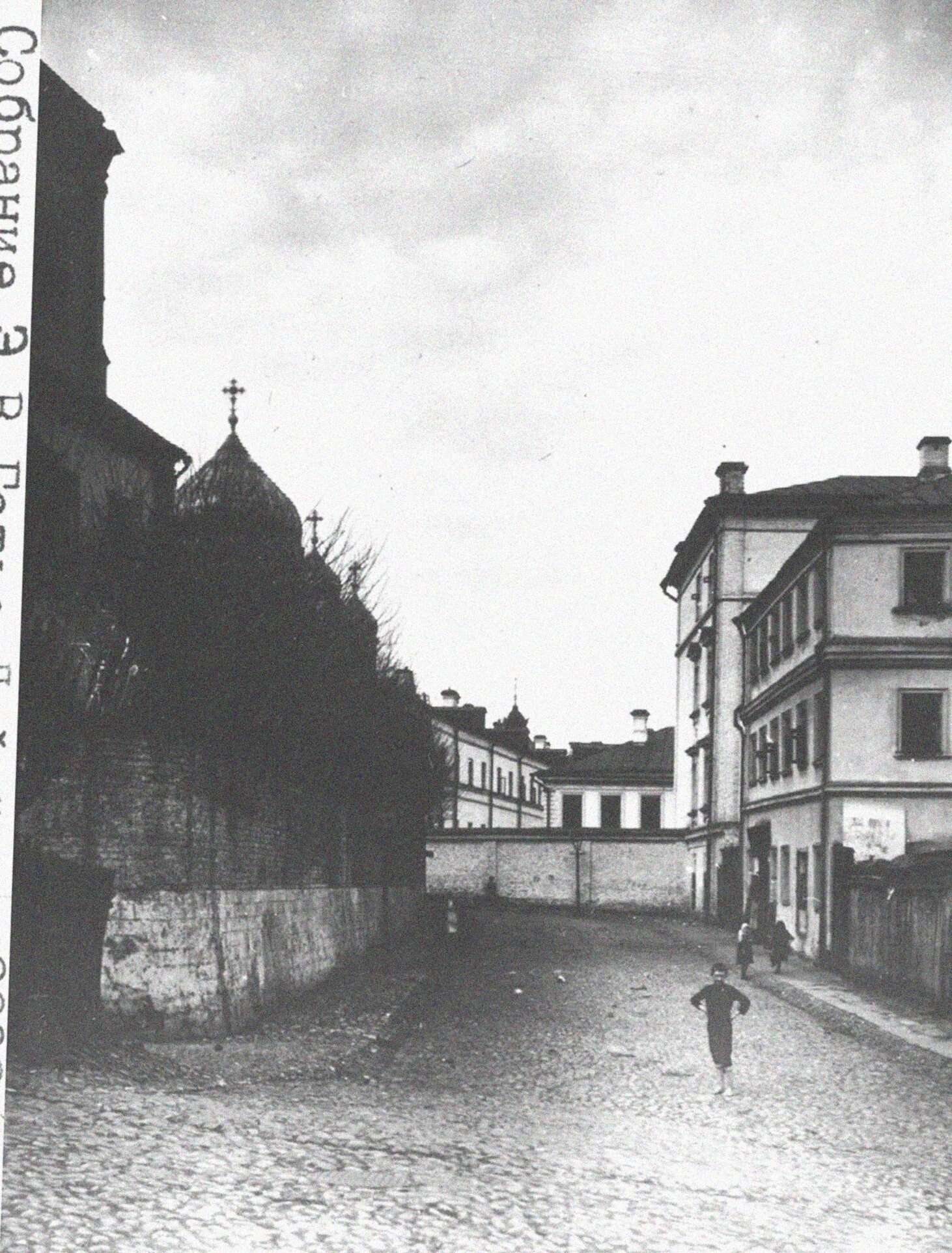 Улица, вымощенная брусчаткой, уходит в перспективу, где виднеются другие городские постройки. На мостовой заметны фигуры людей — один человек, вероятно ребенок, движется по улице, что оживляет композицию и передает атмосферу городской жизни того времени.