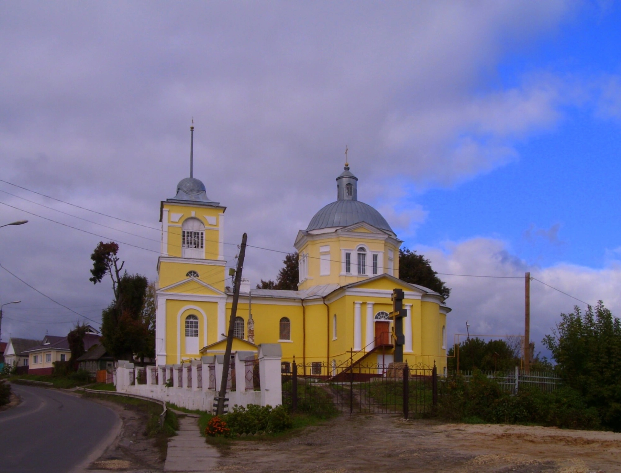 Храм окружён ухоженной территорией, обильной зеленью, что создаёт ощущение уюта и гармонии с природой. К главному входу ведёт аккуратная дорожка, а у входа установлен поклонный крест. Небесный фон с динамичными облаками и просветами лазури добавляет снимку глубины и одухотворённости, подчёркивая величие творения рук человеческих, посвящённого Богу.