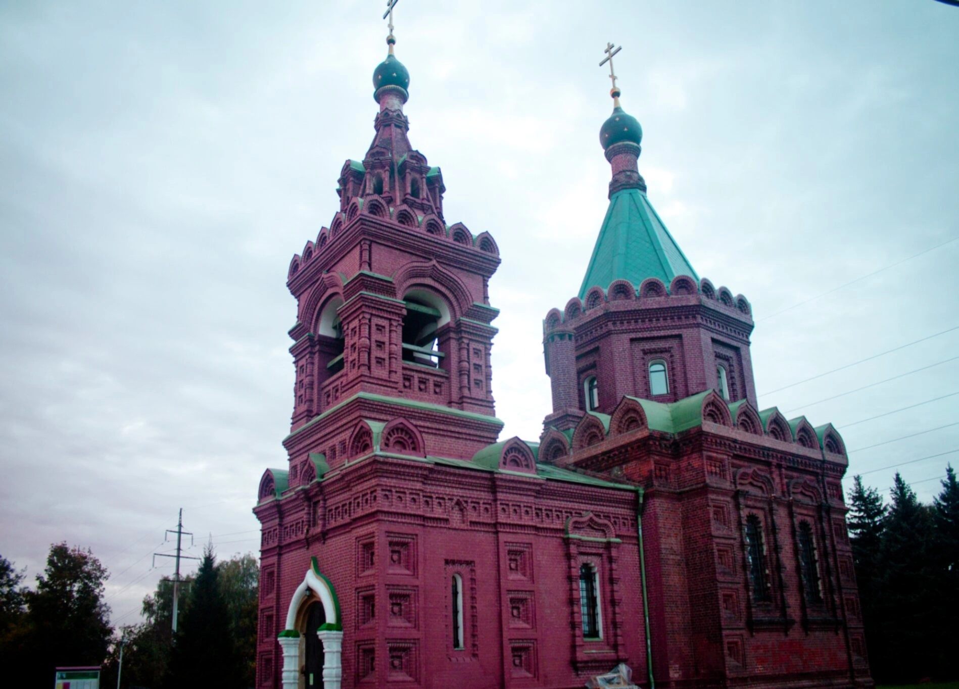 На заднем плане фотографии виднеются хвойные и лиственные деревья, а также линии электропередач, напоминающие о современном окружении древней святыни. Пасмурное небо придает снимку особую атмосферу духовной сосредоточенности и умиротворения, характерную для православных храмов России.