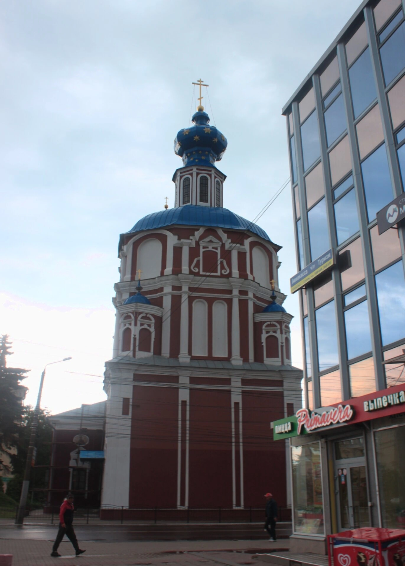 На снимке также видно современное городское пространство, окружающее храм, что подчёркивает гармоничное сочетание исторического наследия и современной жизни. На переднем плане фотографии можно заметить элементы городской инфраструктуры, включая вывески заведений, что создаёт уникальный контраст между духовным и мирским.