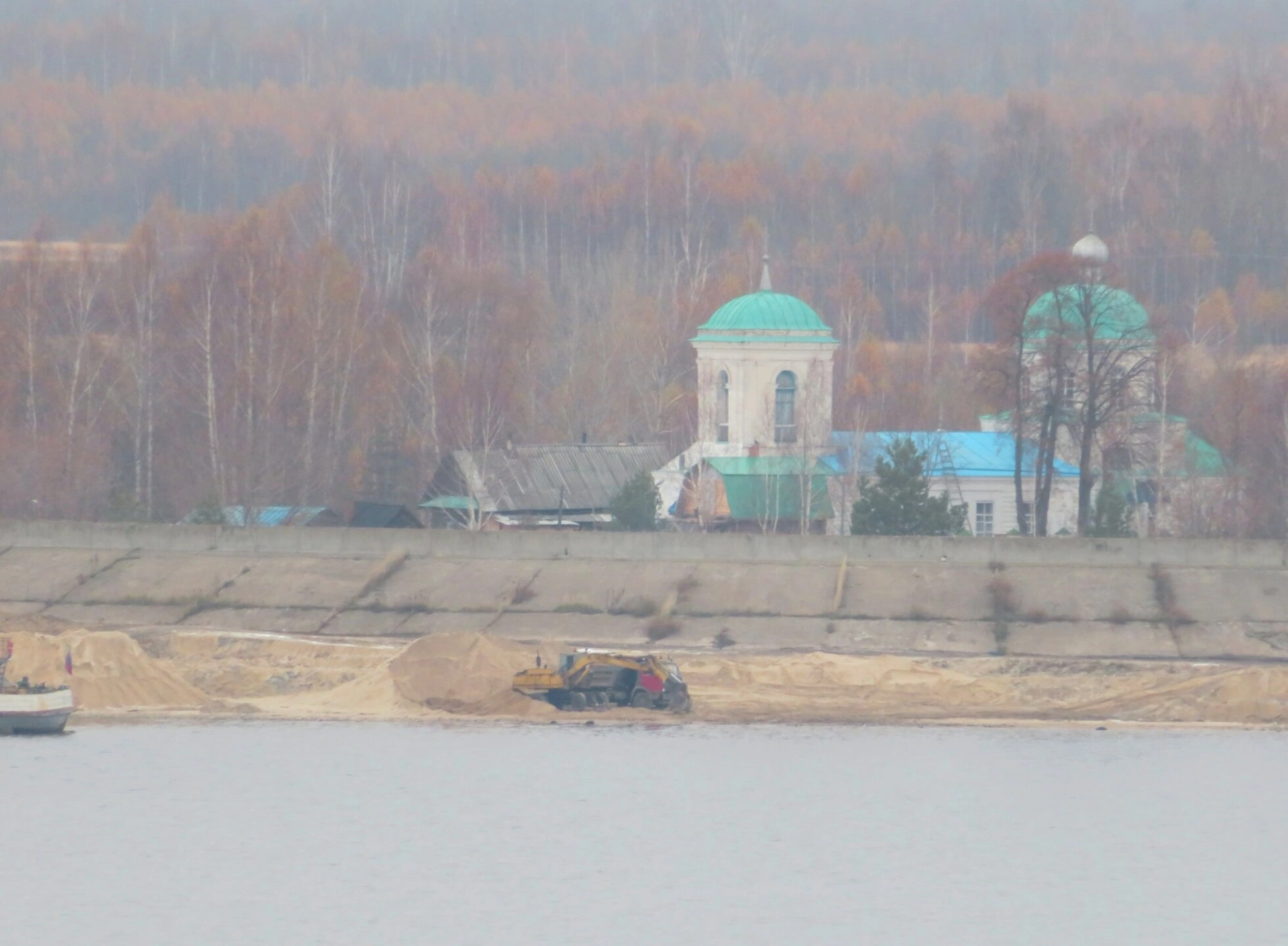 На переднем плане фотографии видна песчаная отмель волжского берега, где ведётся благоустройство прибрежной территории. Часть деревянной лодки на водной глади подчёркивает неразрывную связь храма с рекой, которая испокон веков была и транспортным путём, и источником вдохновения. За церковной оградой открывается панорама осеннего леса, одетого в золотой и багряный убор, что придаёт всему пейзажу умиротворённое и поэтичное звучание.