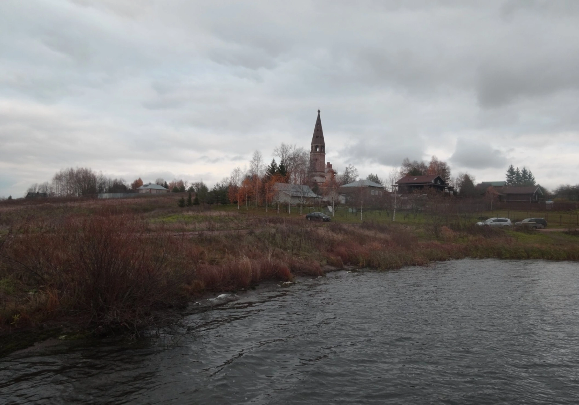 На переднем плане изображения видна гладь реки Шухтомошь, несущей свои темные воды вдоль берегов, поросших кустарником и побуревшей от осенних холодов травой. Поселение, раскинувшееся на возвышенности, окружает храм, создавая единый гармоничный образ православной Руси. Несколько автомобилей у домов подчеркивают, что жизнь в селе продолжается и в наши дни.