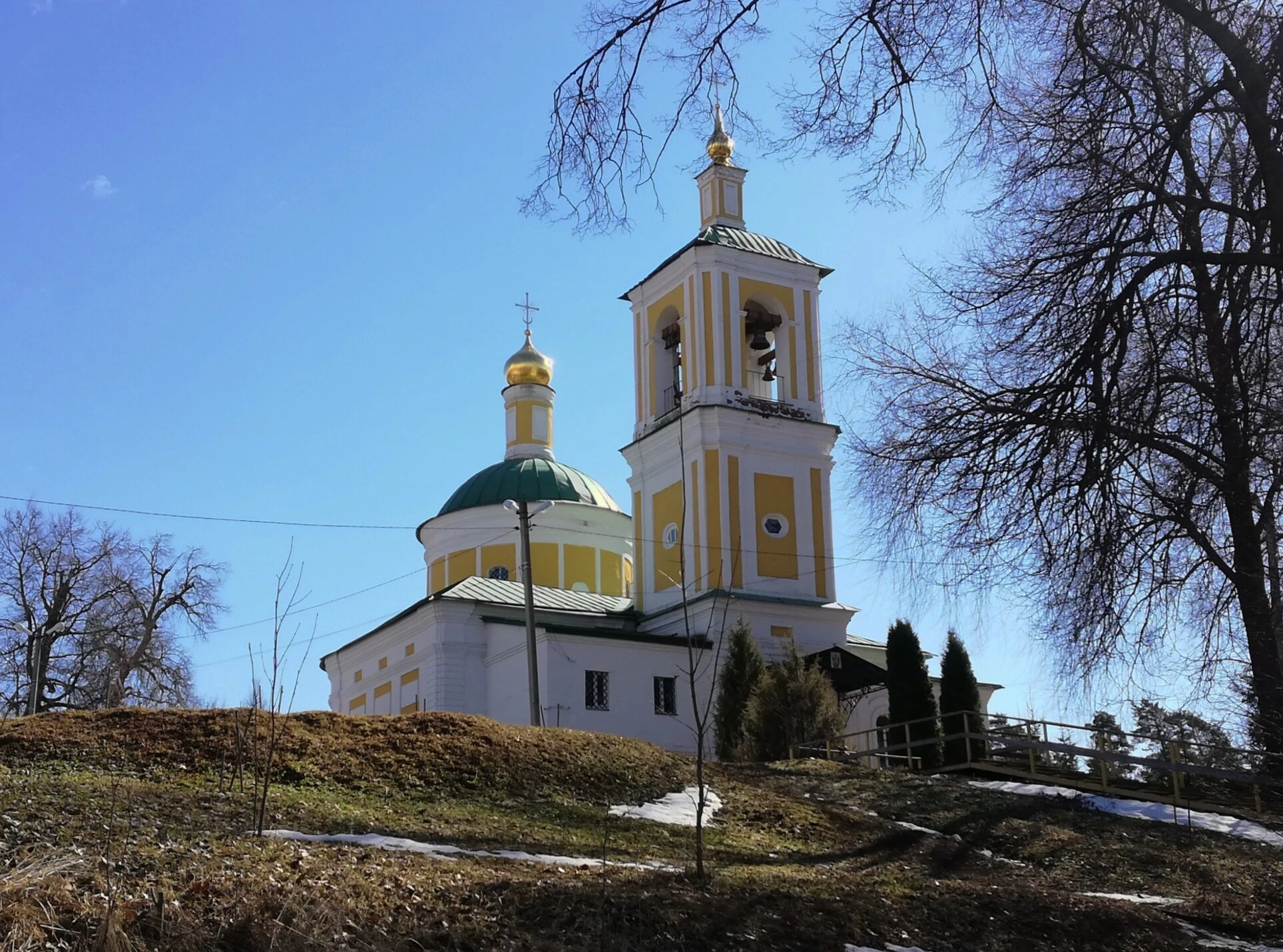 Белокаменный храм с тёмной кровлей и золочёными главками гармонично вписан в природный ландшафт. Высокая шатровая колокольня, увенчанная небольшой главкой, служит вертикальной доминантой всего архитектурного ансамбля. Основной объём церкви завершается традиционным пятиглавием, символизирующим Господа Иисуса Христа и четырёх евангелистов. Снимок сделан в межсезонье, когда деревья, окружающие храм, ещё не покрылись листвой, а на склонах холма кое-где сохраняются остатки снежного покрова, что придает изображению особое настроение смиренного ожидания.