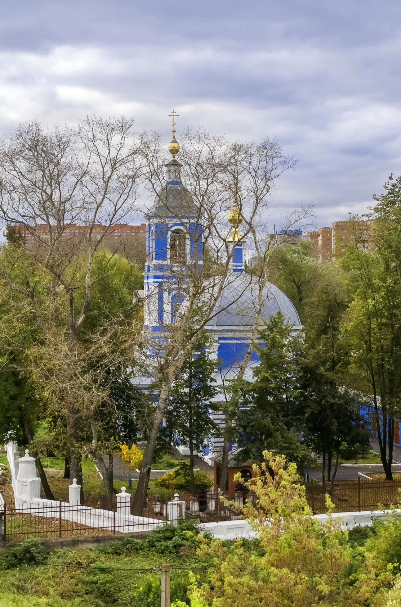 На заднем плане, поверх крон деревьев, просматриваются многоэтажные жилые дома из красного кирпича, что указывает на городское расположение святого места, находящегося в гармонии с жилой застройкой. Общее впечатление от снимка дополняет пасмурное небо, покрытое слоистыми серыми облаками, что придаёт моменту созерцательную, немного смиренную атмосферу, характерную для поздней осени в средней полосе России.