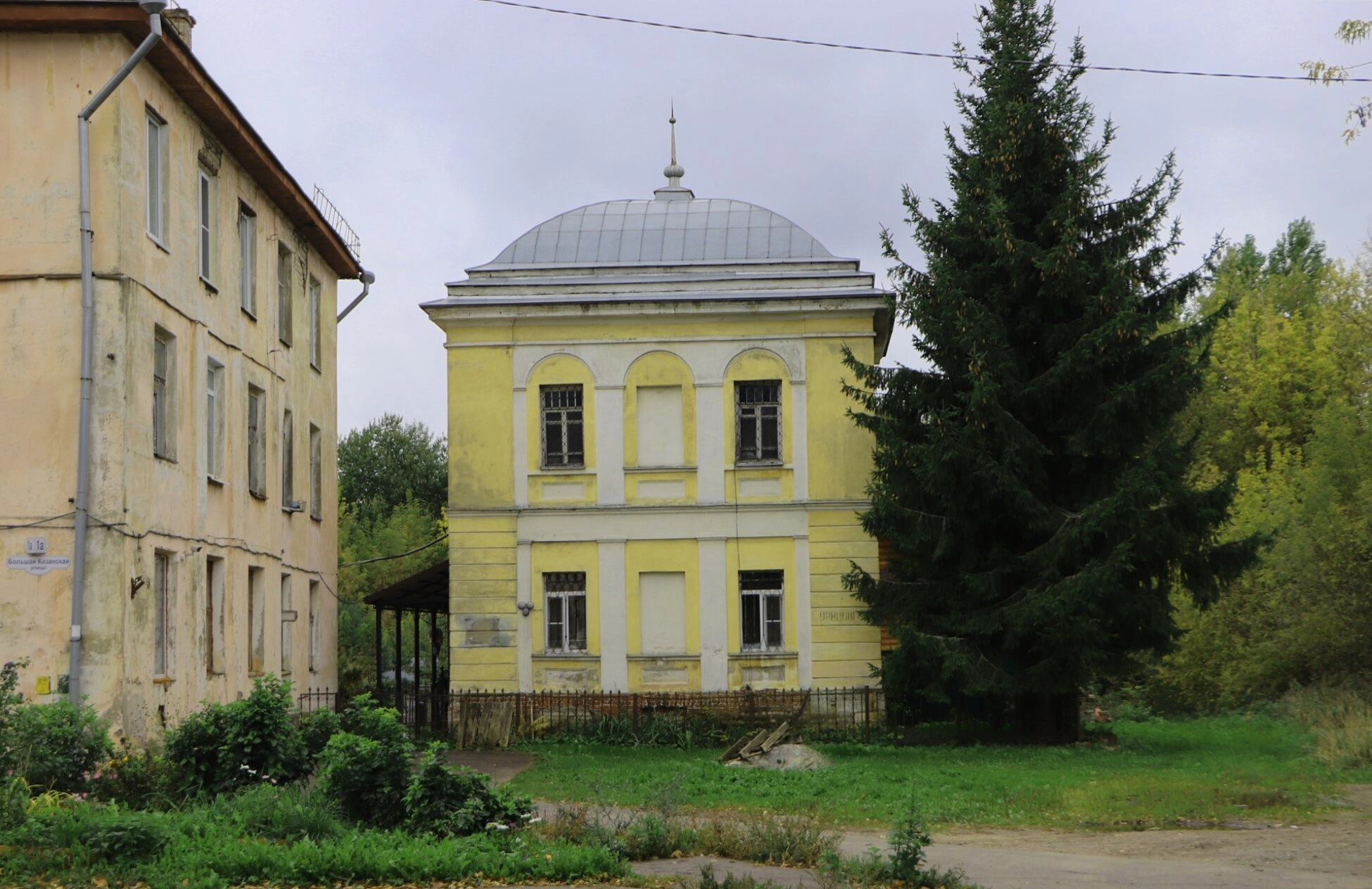 На представленной фотографии запечатлен храм в честь Иверской иконы Божией Матери, находящийся в городе Рыбинске Ярославской области. Это двухэтажное каменное здание бледно-жёлтого цвета, увенчанное металлическим куполом полусферической формы с небольшим шпилем. Фасад украшен арочными окнами на втором ярусе и прямоугольными на первом, обрамлёнными белыми декоративными элементами, что характерно для церковной архитектуры конца XIX века. Здание, к сожалению, пребывает в обветшалом состоянии: часть окон заложена или закрыта, штукатурка местами повреждена, а прилегающая территория заросла травой и кустарником. Слева к храму примыкает жилое строение, а справа возвышается хвойное дерево, создавая контраст между творением человеческих рук и природой.