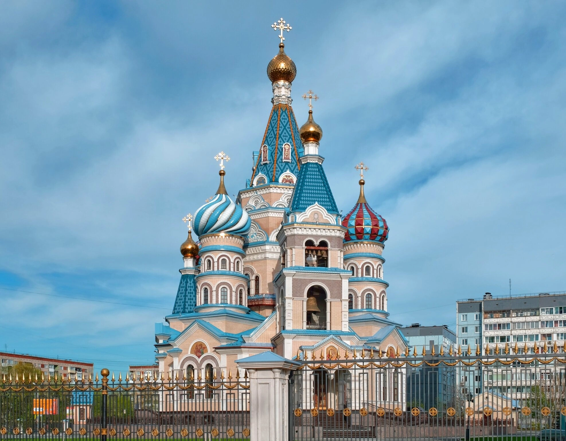 Фасады здания богато украшены декоративными элементами: арками, полуколоннами и килевидными кокошниками, что характерно для церковного зодчества. Чётко просматривается высокая колокольня с арочными проёмами, где размещается звонница. Храм обнесён изящной оградой чёрного цвета с золочёными деталями, что подчёркивает его благолепие и завершённость архитектурного ансамбля. Фотография сделана в ясный день при хорошем освещении, что позволяет в деталях рассмотреть всю красоту этого святого места, на фоне которого виднеются мирские городские постройки, оттеняющие его духовную величину.