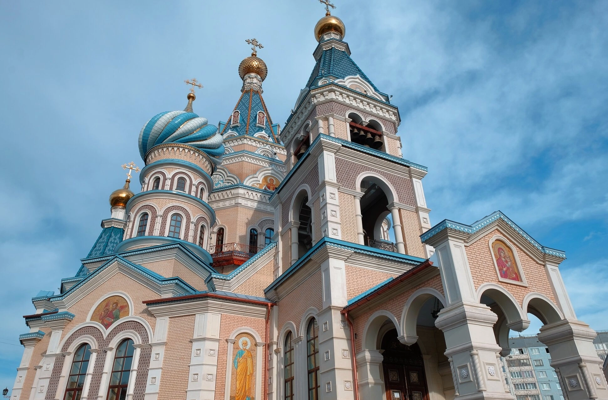 На представленной фотографии запечатлён величественный храм в честь Иверской иконы Божией Матери, расположенный в городе Ижевске. Этот собор является одним из значительных духовных центров Удмуртской митрополии и настоящим украшением города.