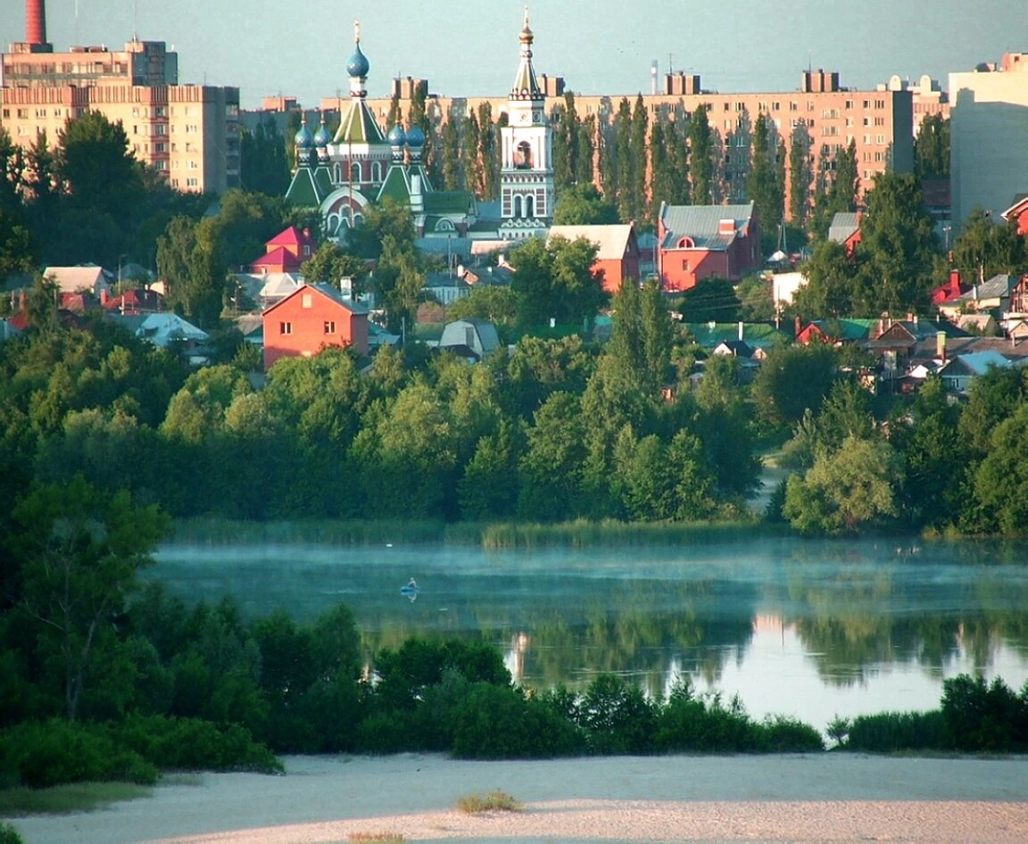 На фотографии запечатлён живописный вид города Воронежа, открывающийся с берега одноимённой реки. Центральное место в композиции занимает величественный храм в честь Казанской иконы Божией Матери. Его стройная колокольня и сияющие на солнце купола создают устремлённый ввысь силуэт, который гармонично отражается в спокойных водах реки Воронеж.