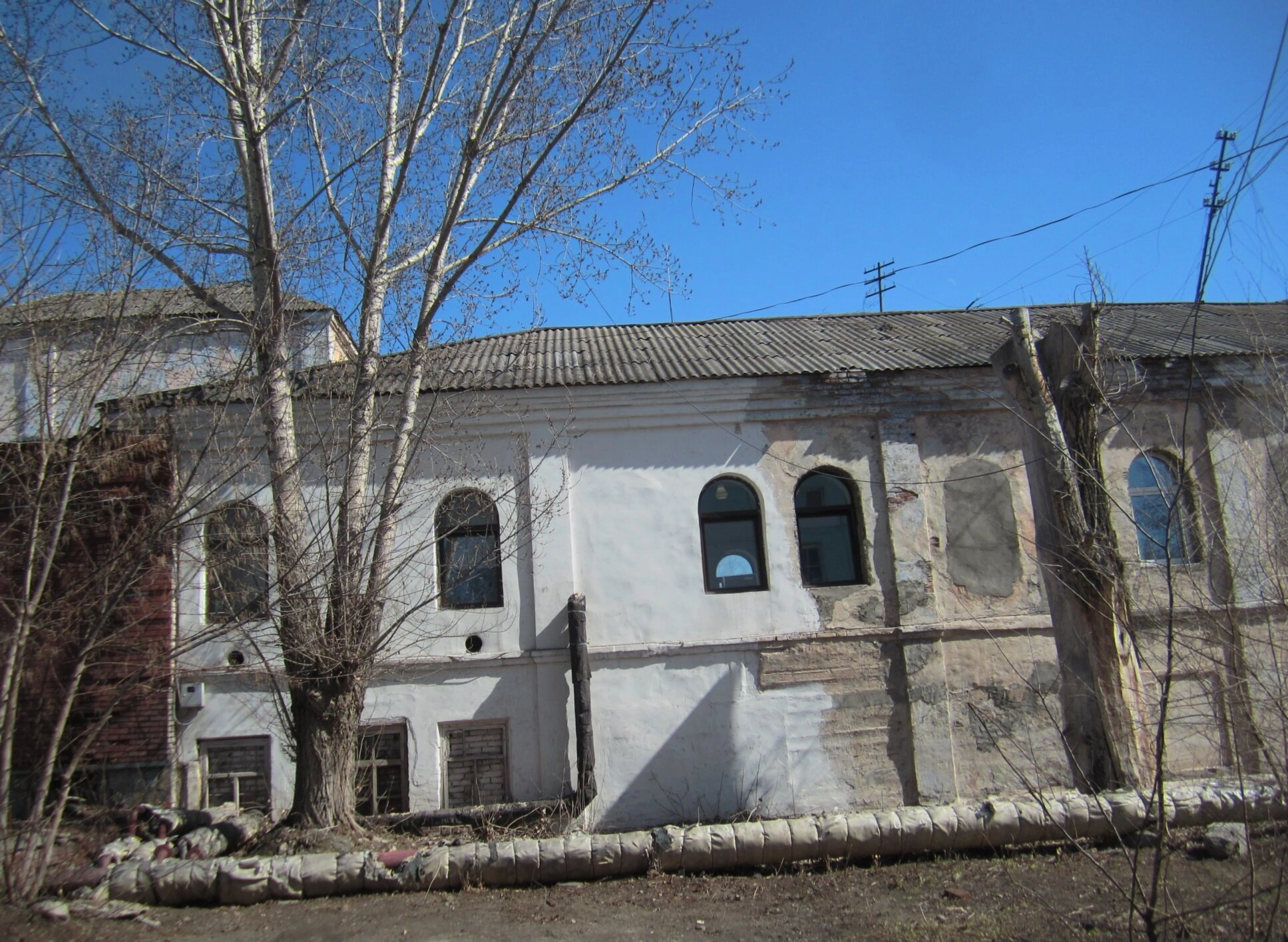 Крыша здания покрыта серым шифером, что типично для храмовых построек данного периода. Перед храмом видны инженерные коммуникации - трубы, покрытые теплоизоляционным материалом, а также голые ветви деревьев, указывающие на ранневесенний или позднеосенний период съёмки.