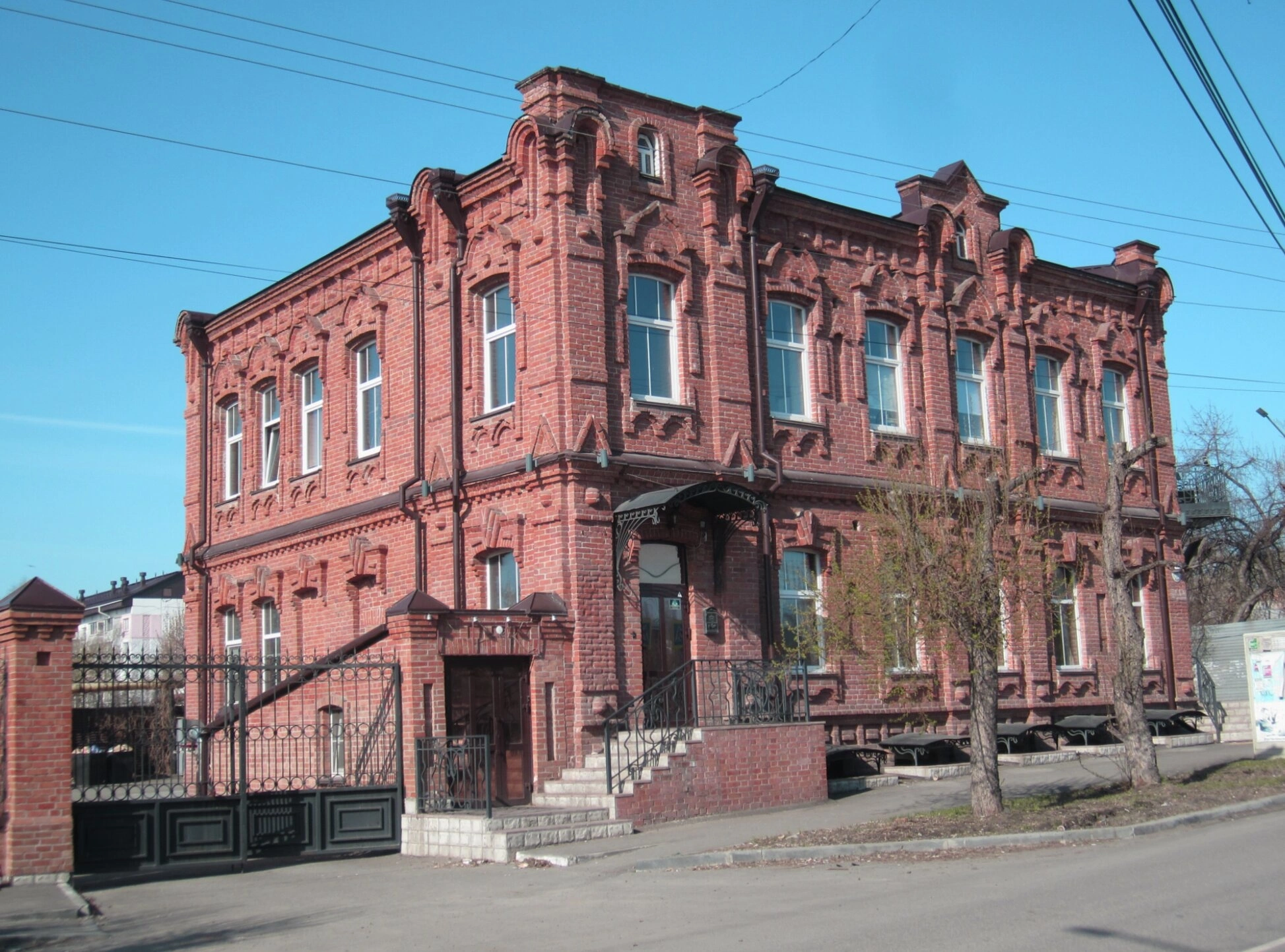 На фотографии запечатлен храм в честь Казанской иконы Божией Матери, расположенный в исторической части города Бийска. Святыня представляет собой кирпичное здание, выполненное в традициях православной церковной архитектуры, и является объектом культурного наследия регионального значения.