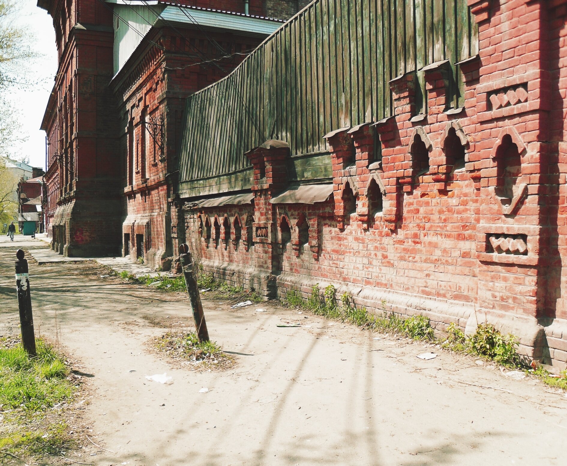 Здание выполнено из красного кирпича с характерными для церковной архитектуры элементами декора. На переднем плане просматривается деревянное ограждение и кирпичная стена с архитектурными украшениями, что свидетельствует о внимании строителей к внешнему облику сооружения. Комплекс расположен в городской среде, о чём говорит грунтовая дорога со следами передвижения.