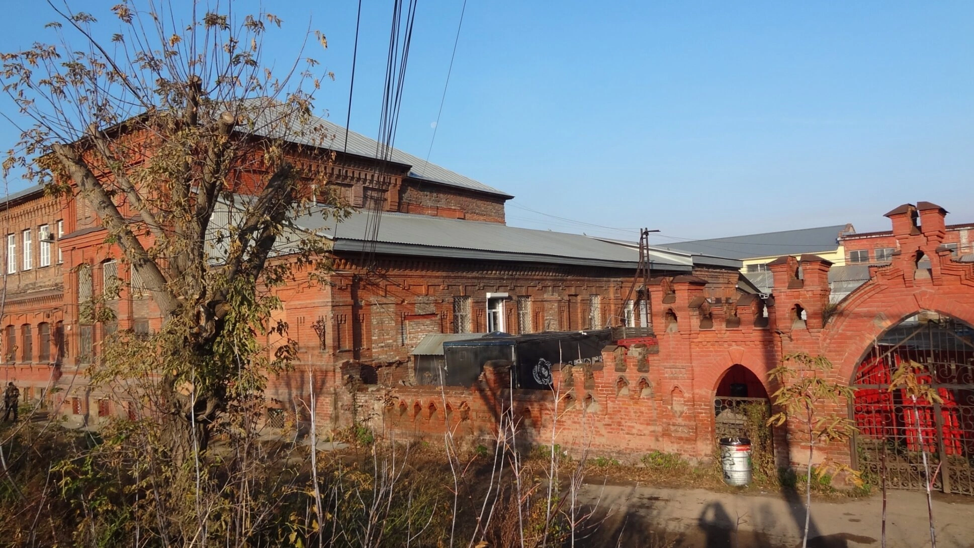 На представленной фотографии запечатлено историческое здание, связанное с Храмом Казанской иконы Божией Матери в городе Бийске. Архитектурный комплекс демонстрирует характерное для сибирского церковного зодчества строение, выполненное из красного кирпича с металлической кровлей.
