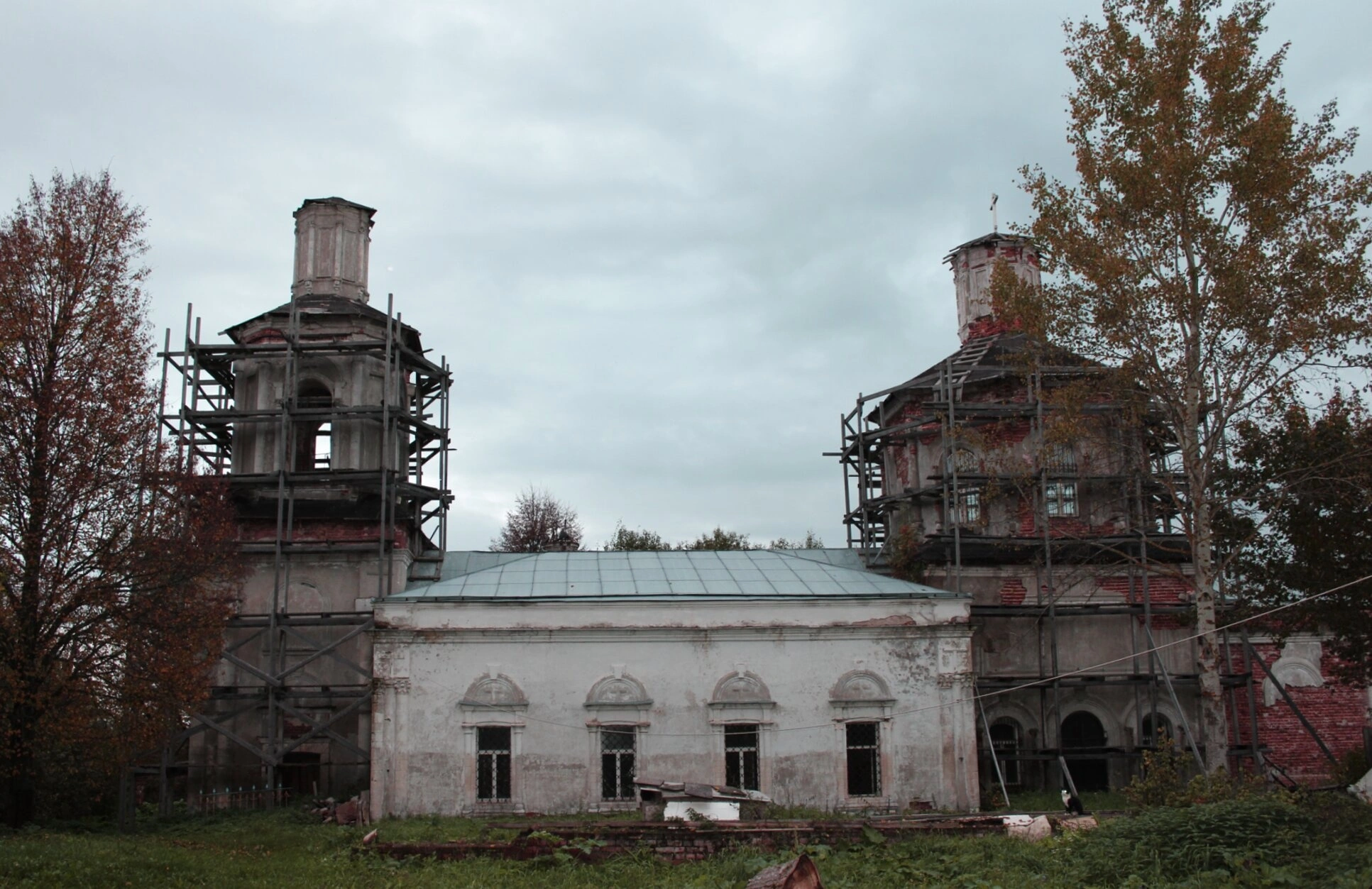 На снимке хорошо просматривается архитектурная композиция храма: центральный объём, увенчанный восьмериком, и колокольня, соединённые между собой более поздней трапезной частью. Леса позволяют проводить работы по восстановлению фасадной кирпичной кладки и элементов декора. Несмотря на ведущиеся работы, храм сохраняет свой благолепный и величественный вид.
