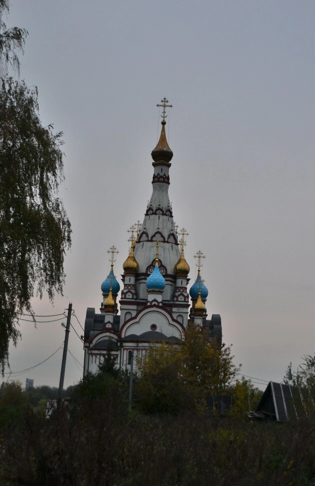 Храм окружен зелеными насаждениями – деревьями и кустарниками, которые создают естественное обрамление для духовной обители. На заднем плане виднеются элементы городской инфраструктуры, что подчеркивает integration храма в городскую среду. Снимок сделан в дневное время при пасмурной погоде, что придает изображению особое настроение и позволяет рассмотреть все архитектурные особенности святыни.