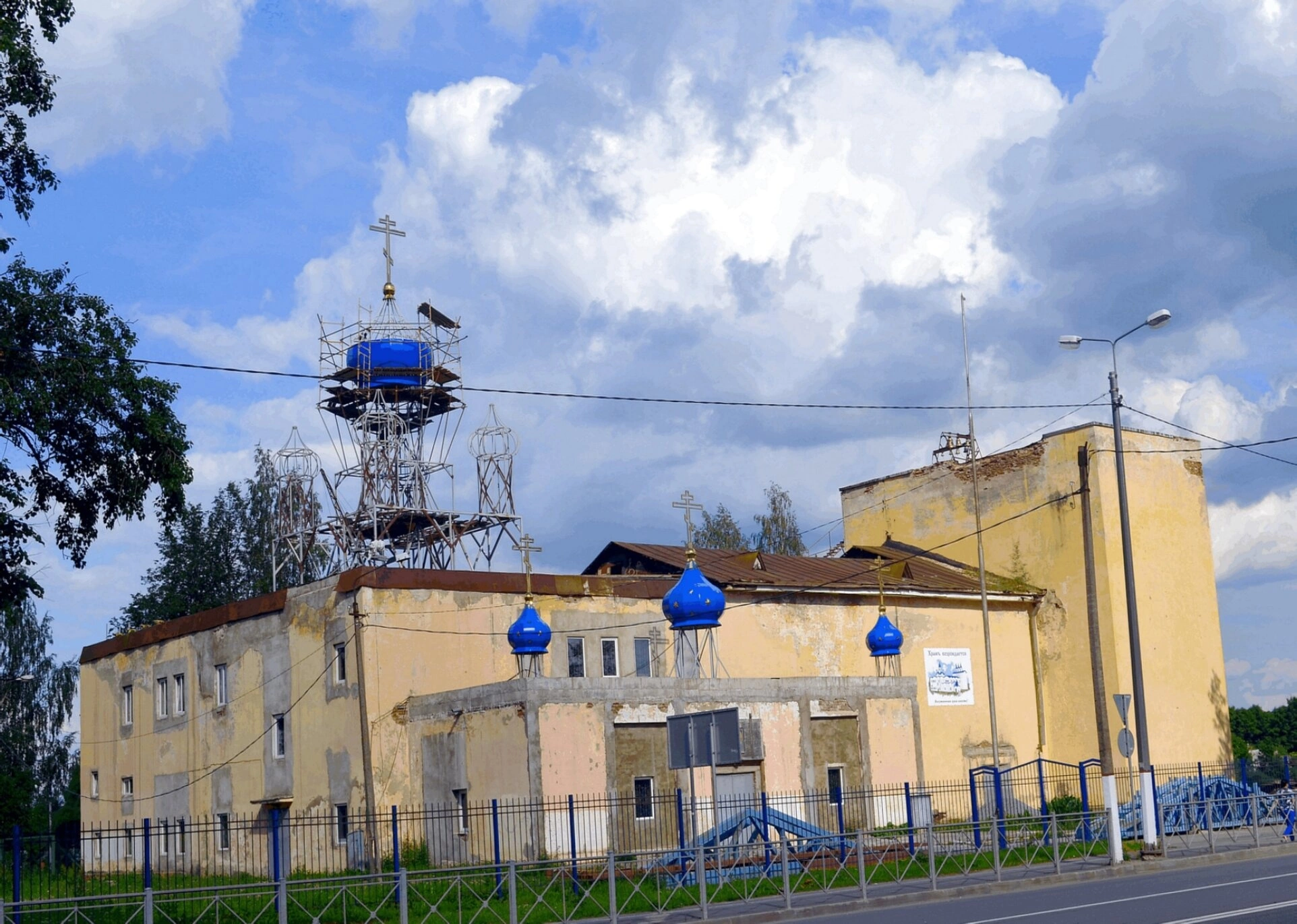 На представленной фотографии запечатлён Храм в честь Казанской иконы Божией Матери, расположенный в городе Тосно Ленинградской области. Снимок фиксирует важный этап в жизни святыни – проведение масштабных реставрационных работ, о чём красноречиво свидетельствуют установленные строительные леса.