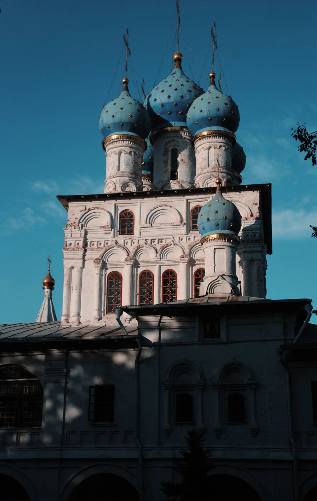 На фотографии запечатлён православный Храм в честь Казанской иконы Божией Матери, расположенный на территории музея-заповедника Коломенское в Москве. Святыня стоит в историческом месте, на высоком берегу Москвы-реки, где издавна находилась царская резиденция.