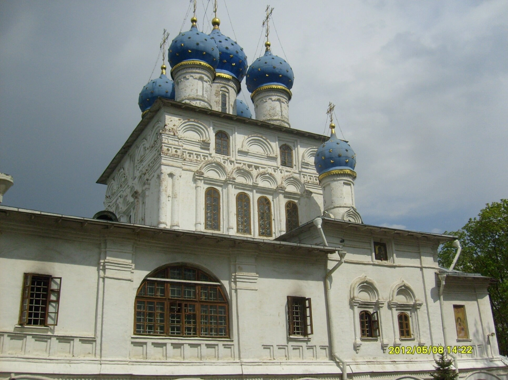 Храм гармонично вписан в природный ландшафт Коломенского. Справа на снимке видна густая зелень деревьев, окружающих святыню, что подчёркивает её уединённое и благодатное расположение. Небо в момент съёмки было затянуто серыми облаками, что придаёт кадру особую, сдержанную атмосферу и позволяет детально рассмотреть все архитектурные формы без ярких солнечных бликов. В правом нижнем углу фотографии зафиксирована дата её создания: 8 мая 2012 года.