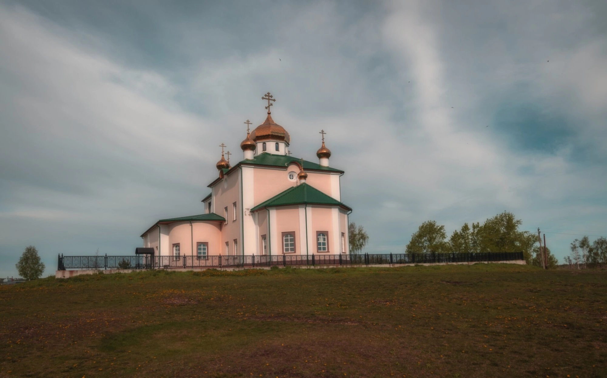 Храм стоит на живописном возвышении, словно благословляя собой окрестные просторы, что подчёркивает его особую роль духовной доминанты всего села. Территория вокруг церкви благоустроена, покрыта ухоженным зелёным травяным покровом и обнесена тёмным ограждением, обеспечивающим тишину и покой святого места. На заднем плане открывается вид на могучие уральские деревья и высокое облачное небо, создающее ощущение величия и Божьего присутствия.
