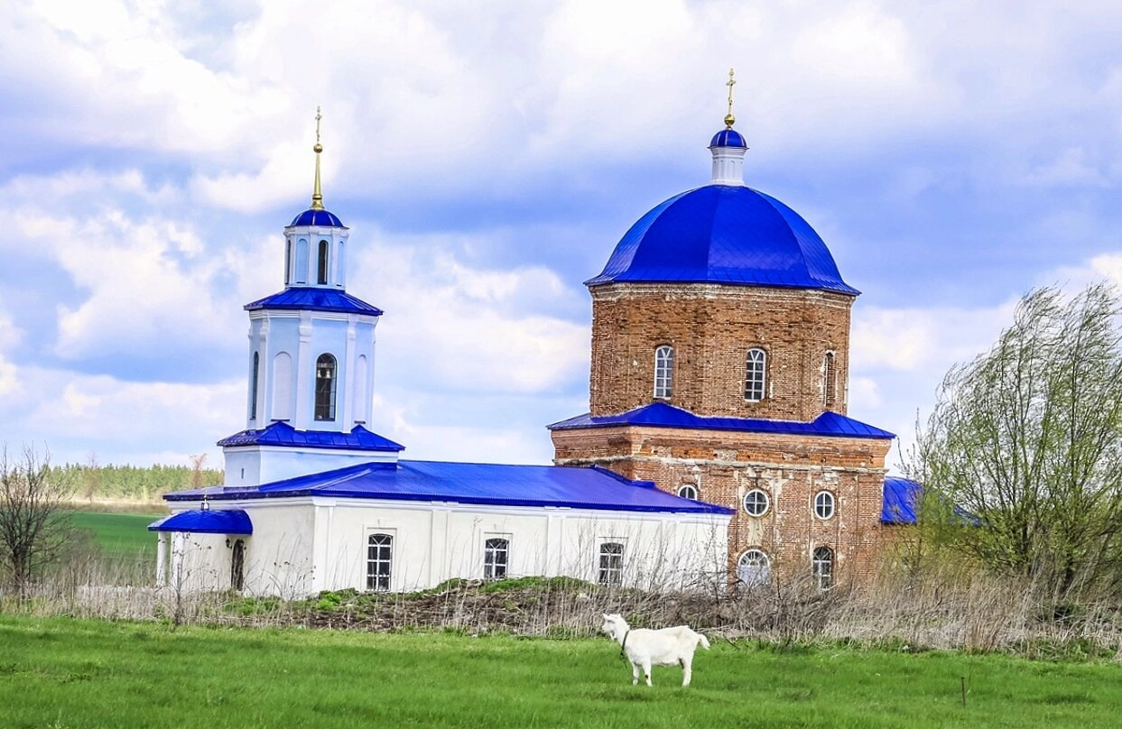 Особую живость и умиротворённость в композицию снимка вносит пасущаяся на переднем плане белая коза — символ мирной сельской жизни, гармонии творения Божия. Небесный свод, представленный на фотографии, наполнен динамикой: сквозь мощные облачные массивы пробиваются лучистые просветы голубого неба, словно знамение Божественного благословения над этой святой землёй. Данный образ передаёт не только архитектурную красоту православной святыни, но и дух тишины, молитвенного покоя и благодати, свойственный этому месту.