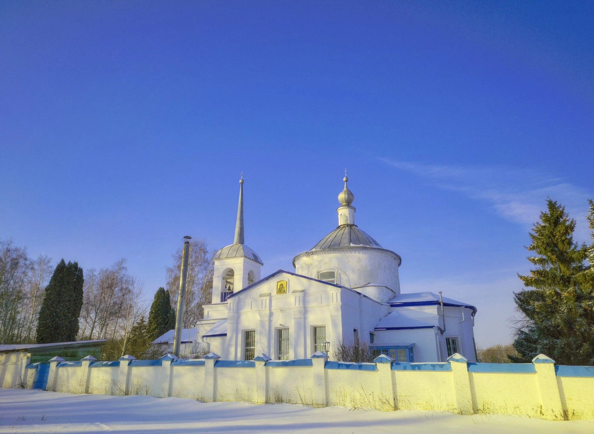 На представленной фотографии запечатлён храм в честь Казанской иконы Божией Матери, расположенный в селе Дубики Ефремовского района Тульской области. Этот православный храм является значимым памятником культурного наследия и духовным центром для местных жителей и паломников.