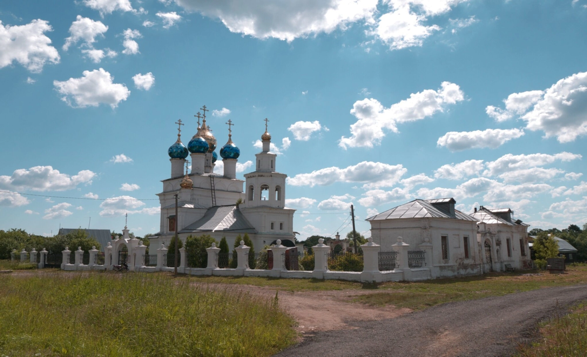 Святыня обнесена аккуратной оградой, отделяющей благодатное пространство храма от окружающей полевой местности. Рядом виднеются скромные строения, вероятно, относящиеся к церковному хозяйству или жилые дома местных жителей. Фотография сделана в ясный день, когда небесная лазурь, проступающая сквозь легкие облака, создаёт идеальное освещение, подчёркивая величие и благолепие дома Божия.