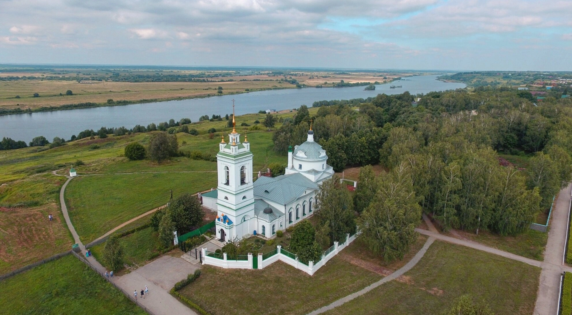 Белые стены церкви эффектно контрастируют с голубой гладью неба и зеленью окружающих склонов, создавая неповторимый образ русского православного храма, гармонично вписанного в приокский пейзаж. Этот святой место привлекает как паломников, так и ценителей русской истории и культуры.