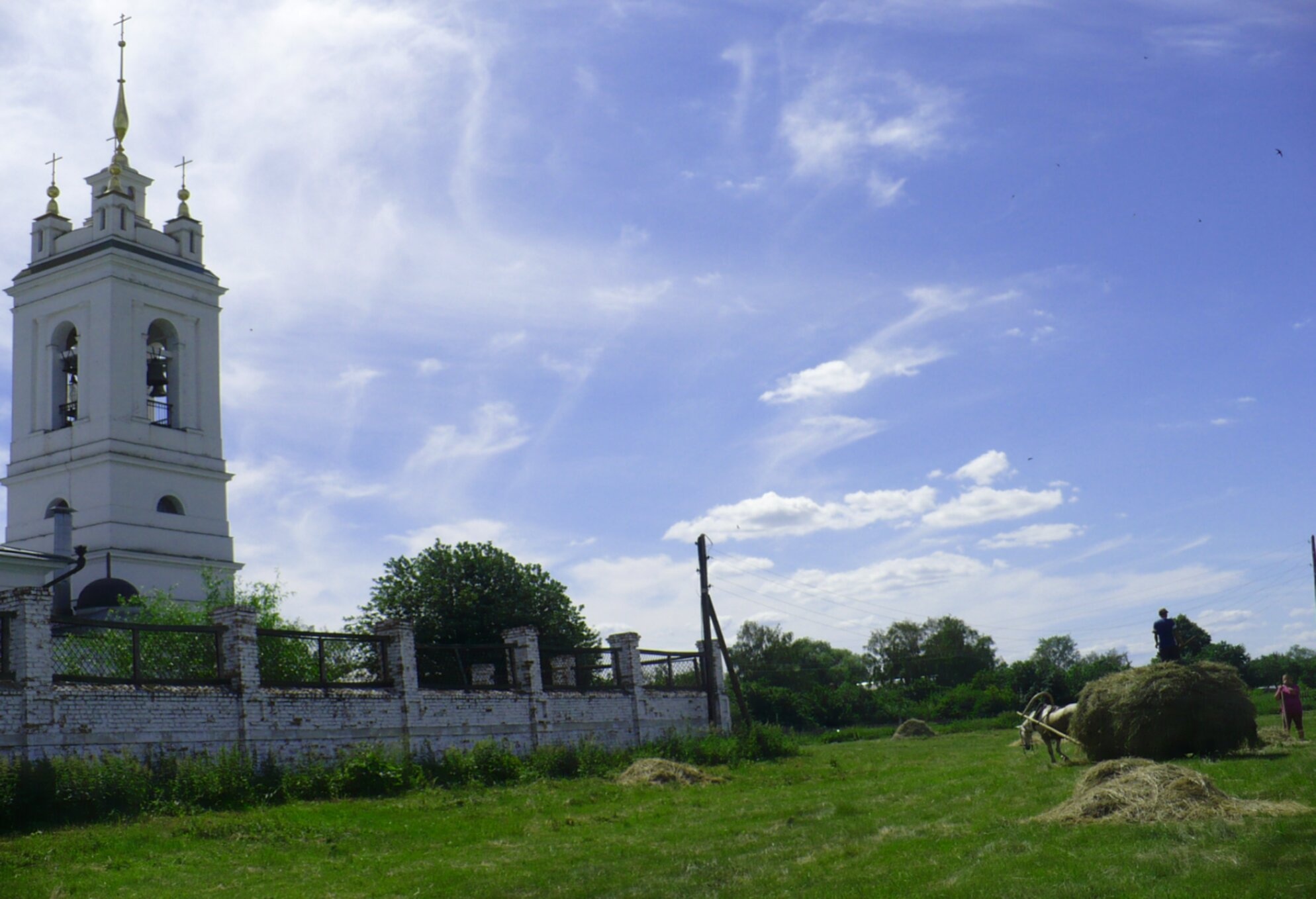 С правой стороны от храма простирается умиротворяющий сельский пейзаж: зелёное поле со стогами сена, что придаёт снимку особый дух русской глубинки. На горизонте виднеется полоса леса и линии электропередач, гармонично вписавшиеся в окружающий ландшафт. Небесный свод над храмом чист и ясен, лишь несколько лёгких белых облаков дополняют картину светлого дня.