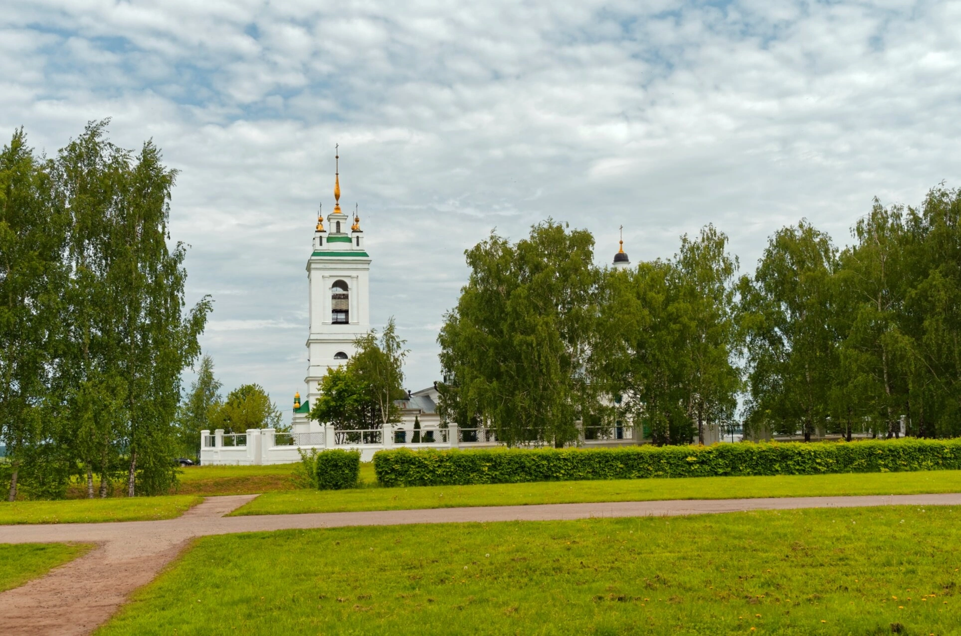 На фотографии запечатлена жемчужина рязанской земли — Церковь Казанской иконы Божией Матери, что возвышается в селе Константиново на высоком правом берегу реки Оки. Этот белоснежный храм, увенчанный златоглавыми куполами, является не только духовным центром, но и одной из главных достопримечательностей, неразрывно связанной с именем великого русского поэта Сергея Александровича Есенина.