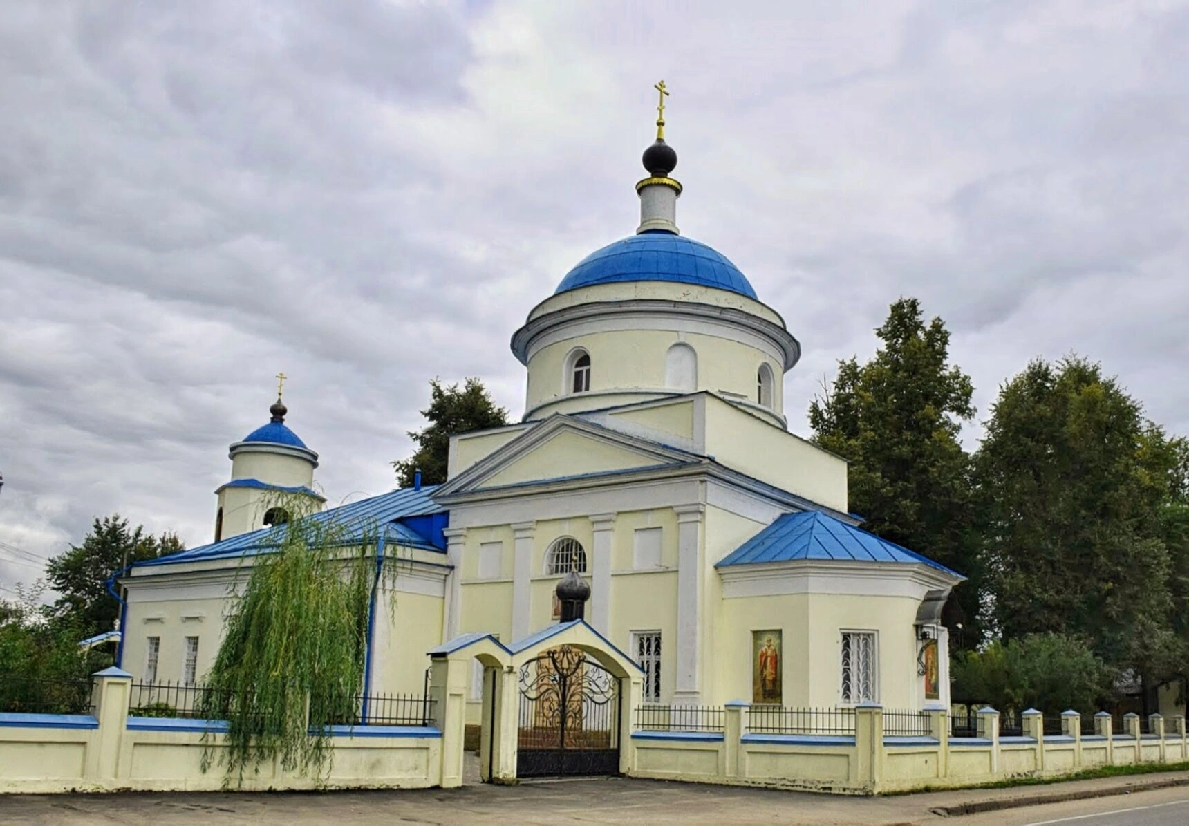 Храм окружён аккуратной оградой на каменном основании, которая отделяет священное пространство от мирской суеты. В тёплое время года, предположительно запечатлённое на снимке, церковь утопает в зелени деревьев, что создаёт ощущение уюта и благодати. Несмотря на пасмурную погоду, здание выглядит светло и величественно, являясь неотъемлемой частью православного ландшафта Подмосковья и свидетельством непрерывности духовной традиции.