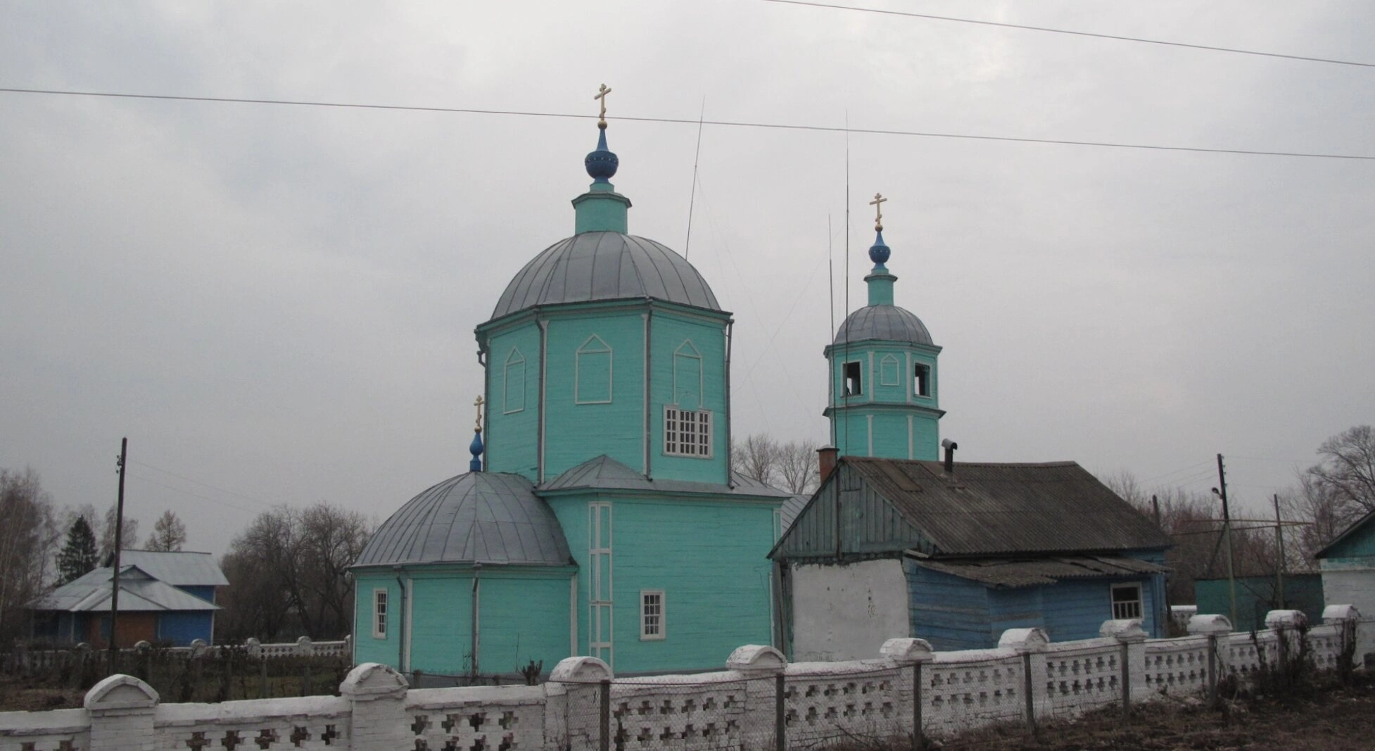 Территория вокруг церковного здания благоустроена и огорожена аккуратным белым забором с декоративными элементами, подчёркивающими особый статус этого места. На заднем плане фотографии видны оголённые деревья, что указывает на съёмку в зимний или позднеосенний период, а пасмурное небо придаёт изображению особую, созерцательную атмосферу.